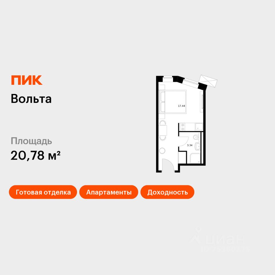 Продаются апартаменты-студия площадью 20,78 кв.м на 14 этаже 15 этажного дома (Вольта, Секция 1) проекта ПИК Вольта.