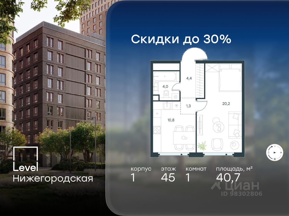 В активно развивающемся районе на юго-востоке столицы продается 1-комнатная квартира площадью 40,7 кв.м без отделки.. Квартира расположена на 45 этаже 45-этажного этажного корпуса 1 в жилом комплексе комфорт-класса Level Нижегородская (компания Level Group/Левел групп).