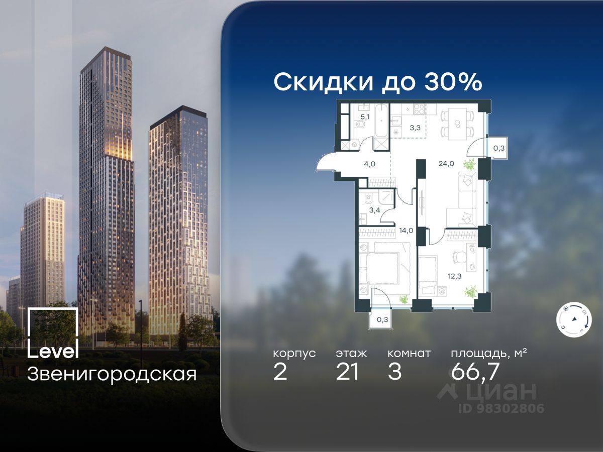 В жилом квартале продаётся 3-комнатная квартира площадью 66.70 кв.м без отделки. Квартира расположена на 21 этаже 64 этажного корпуса 2 в жилом комплексе комфорт класса Level Звенигородская (компания Level Group/Левел групп).