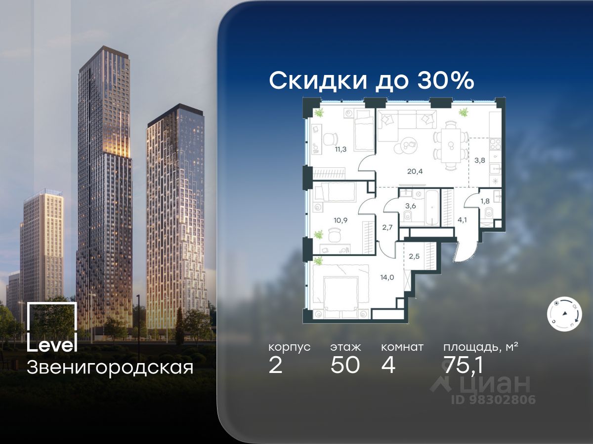В жилом квартале продаётся 4-комнатная квартира площадью 75.10 кв.м без отделки. Квартира расположена на 50 этаже 64 этажного корпуса 2 в жилом комплексе комфорт класса Level Звенигородская (компания Level Group/Левел групп).