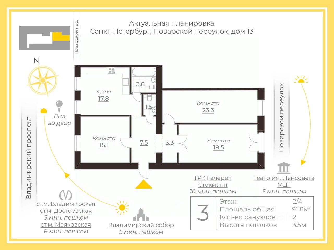 Поварской переулок сочетает центр города и тишину (благодаря одностороннему движению). Пешая доступность: - 5 мин до м. ''Владимирская'' и ''Достоевская'' - 10 мин до м. ''Площадь Восстания'' и Московского вокзала - 10 мин до ТРК ''Галерея'' и ''Стокманн'' - 15 мин до Таврического сада