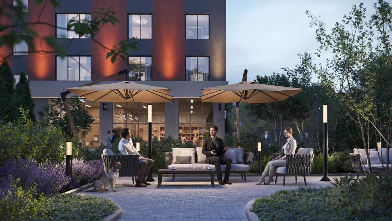 Двор с ландшафтным озеленением разделен на три зоны. Для детей игровые площадки с меловыми досками и уличными шахматами, для взрослых лаунж-зона с креслами и столиками для отдыха, для спортсменов воркаут-площадка. На первом этаже лобби-клуб с игровыми комнатами, залом для йоги, коворкингом и мини-кинотеатром, колясочные и велосипедные помещения.
