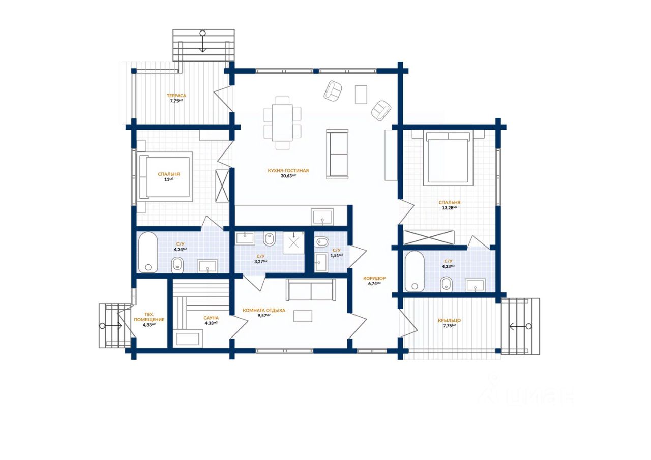 Ильма 110 просторный одноэтажный дом из клееного бруса площадью 110 м². 3 спальни, 4 санузла, кухня-гостиная с большими окнами всё для комфортной жизни вашей семьи!