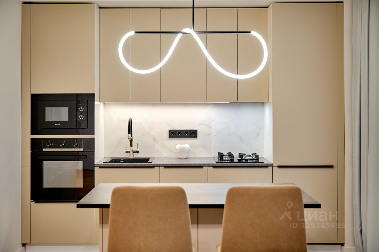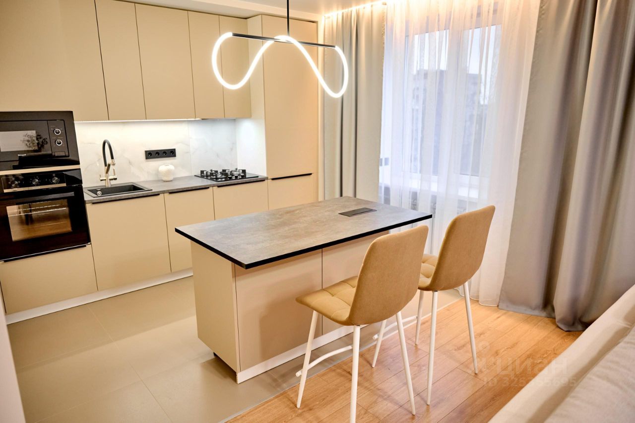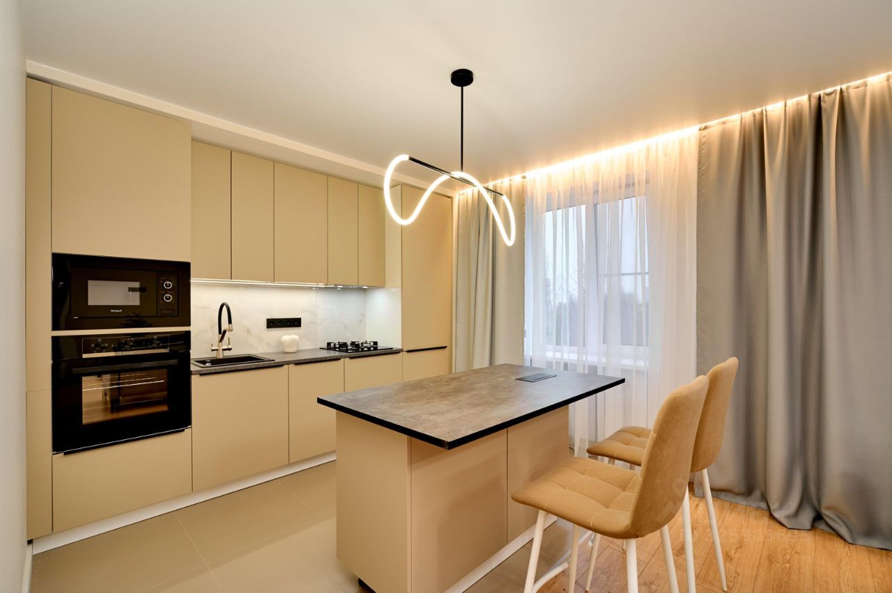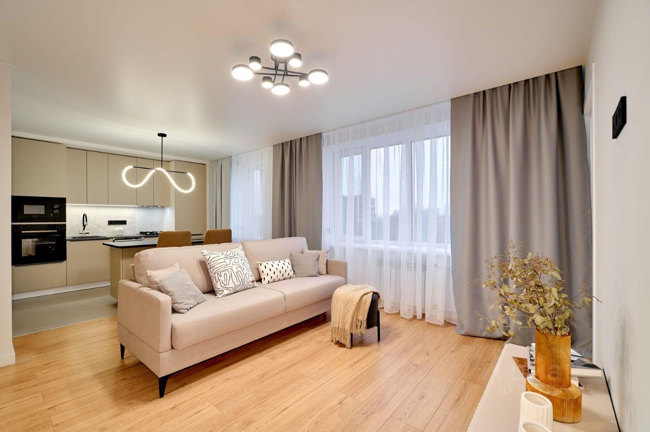 В квартире выполнен дизайнерский ремонт. Никто не жил, все новое. Удобная планировка включает две комнаты. Кухня объединена с гостинной, общее пространство более 26 кв. метров. Санузел раздельный. Окна выходят как на улицу, так и во двор. Изо всех окон отличная панорама города. Рядом нет других домов. Есть балкон.
