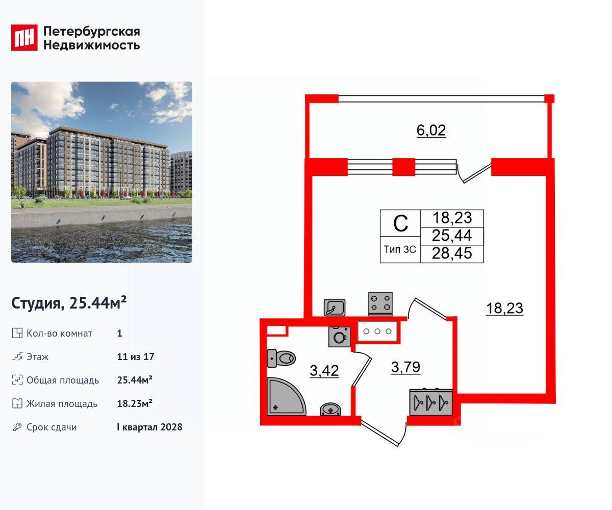 Удобная, классическая, функциональная европланировка, просторная прихожая 3.79 м². Общая площадь студии - 25.44 м², жилая 18.23 м², высота потолка 2.77 м.