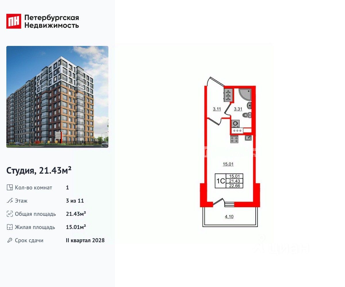 Удобная, классическая, функциональная европланировка, вместительная прихожая 3.11 м². Общая площадь студии - 21.43 м², жилая 15.01 м², высота потолка 2.77 м.