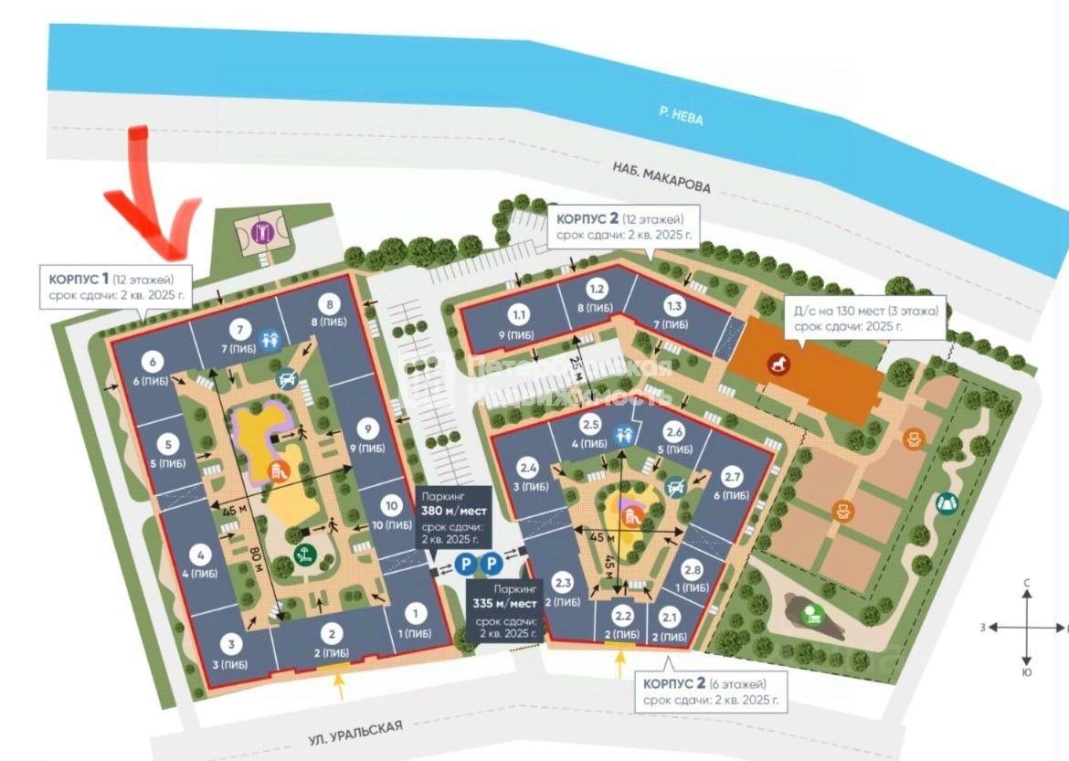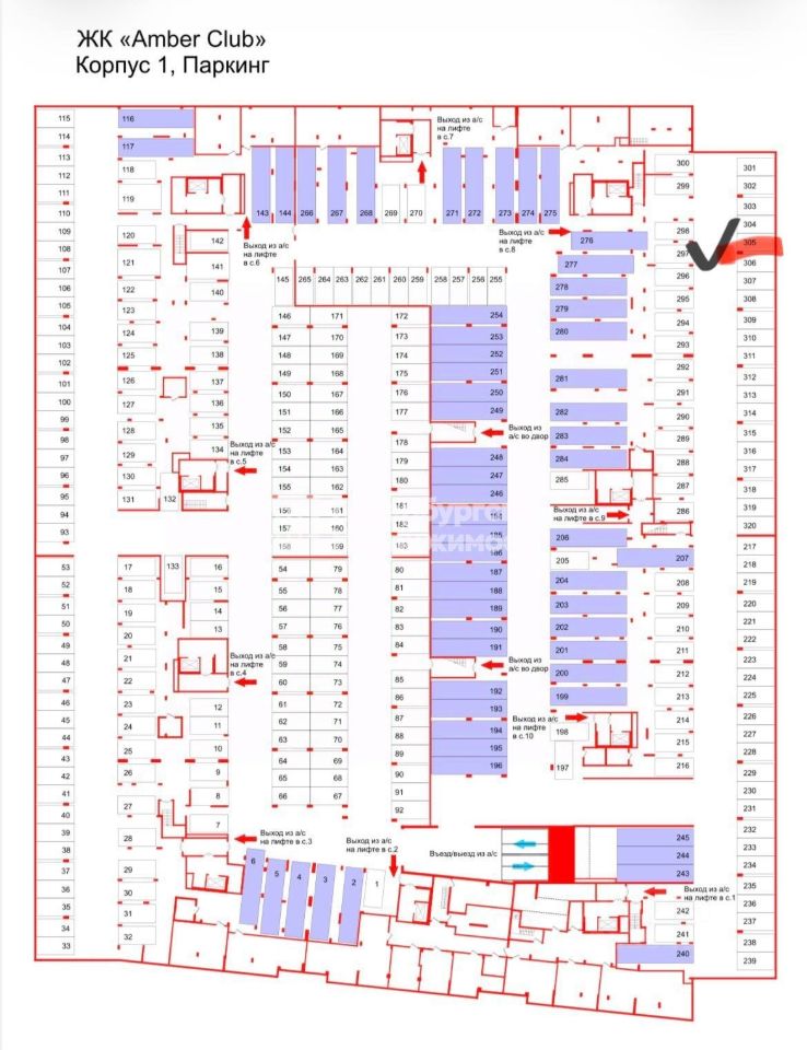 Машино-место номер 305 расположено в 1 корпусе ЖК ближе к 8 секции