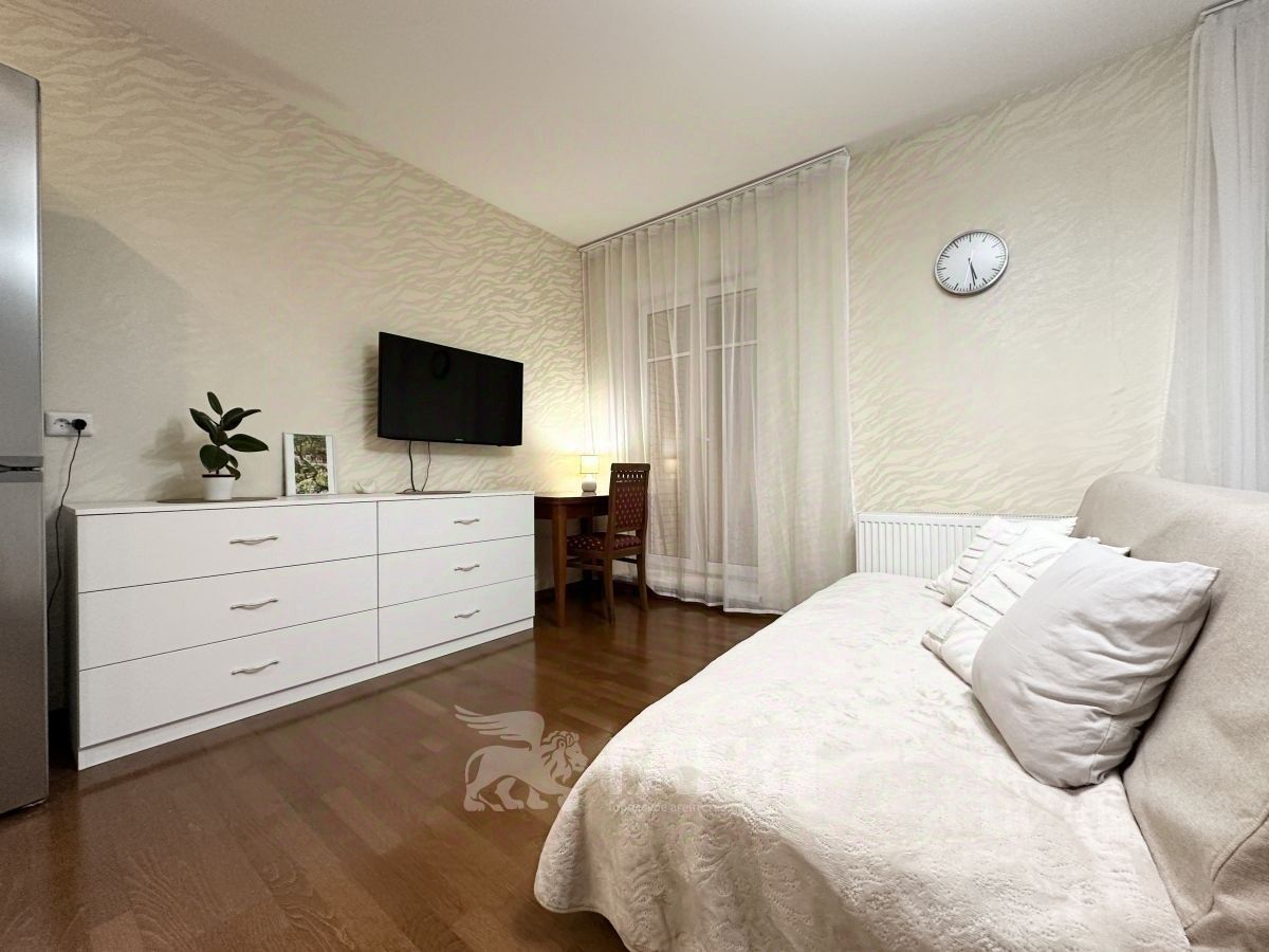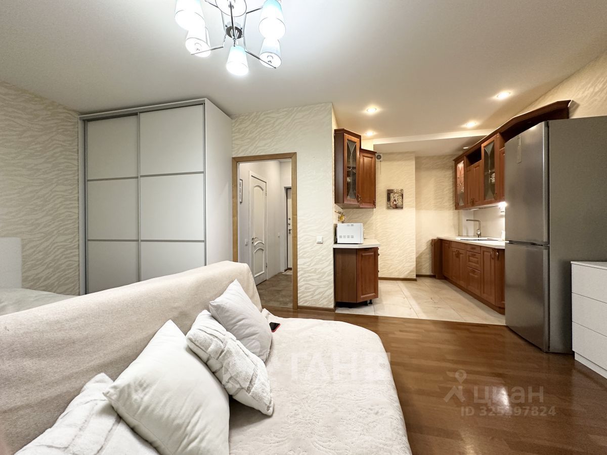 Светлая просторная квартира свободной планировки. При желании можно возвести перегородку и произвести зонирование. Французские окна в пол. На полу в ванной и коридоре - плитка. В комнате и на кухне - паркетная доска. Квартира оборудована всей необходимой мебелью и техникой. Большой шкаф в комнате, зеркальный встроенный шкаф в прихожей, телевизор, диван, кухонная мебель, холодильник Bosh. Вся мебель и техника остается новым хозяевам. Забирается только кровать.