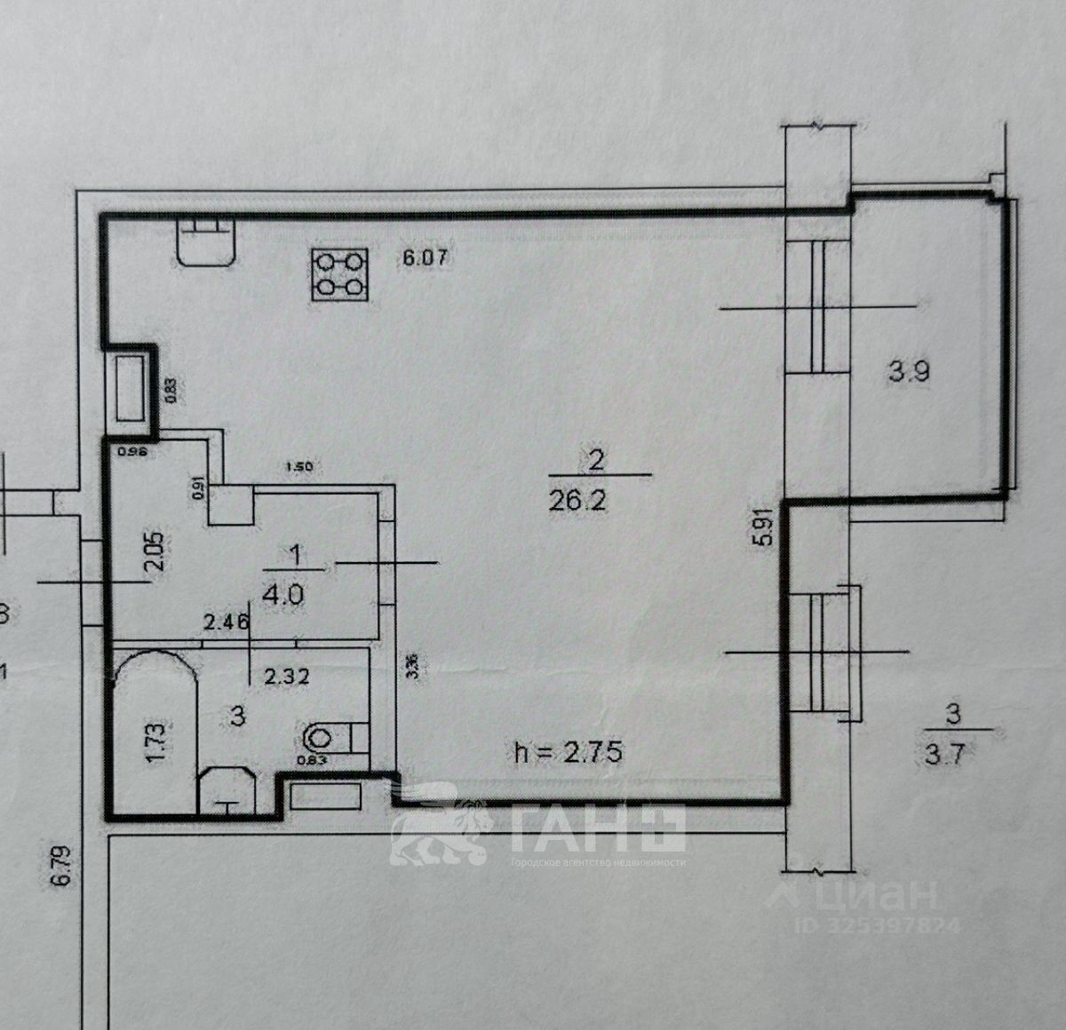 Общая площадь 36 кв. м., кухня 15 кв. м., комната 12 кв. м., Прекрасный вид из окон
