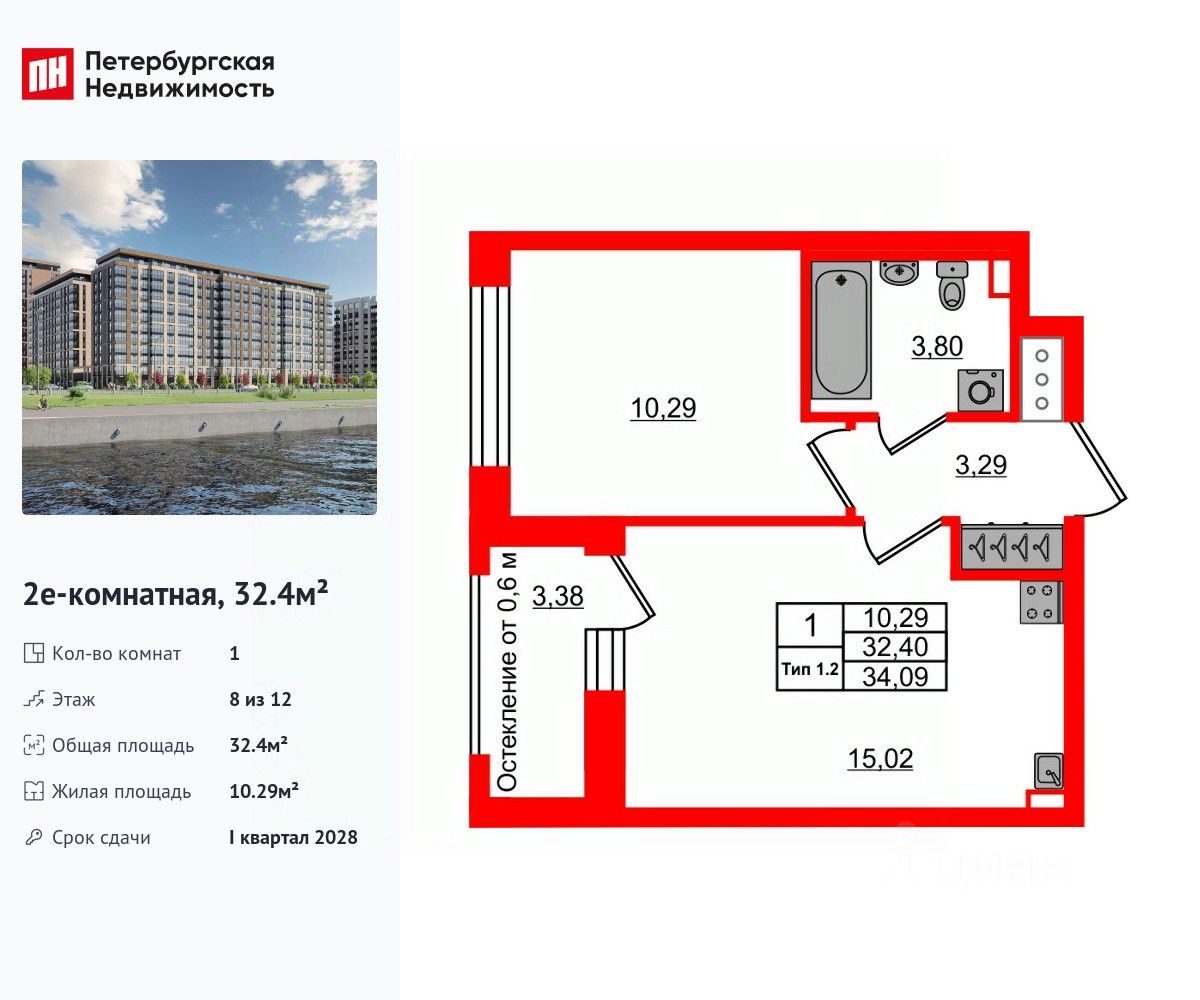 Удобная, классическая, функциональная европланировка, большая кухня-гостиная 15.02 м², вместительная прихожая 3.29 м². Общая площадь квартиры - 32.4 м², жилая 10.29 м², высота потолка 2.77 м.