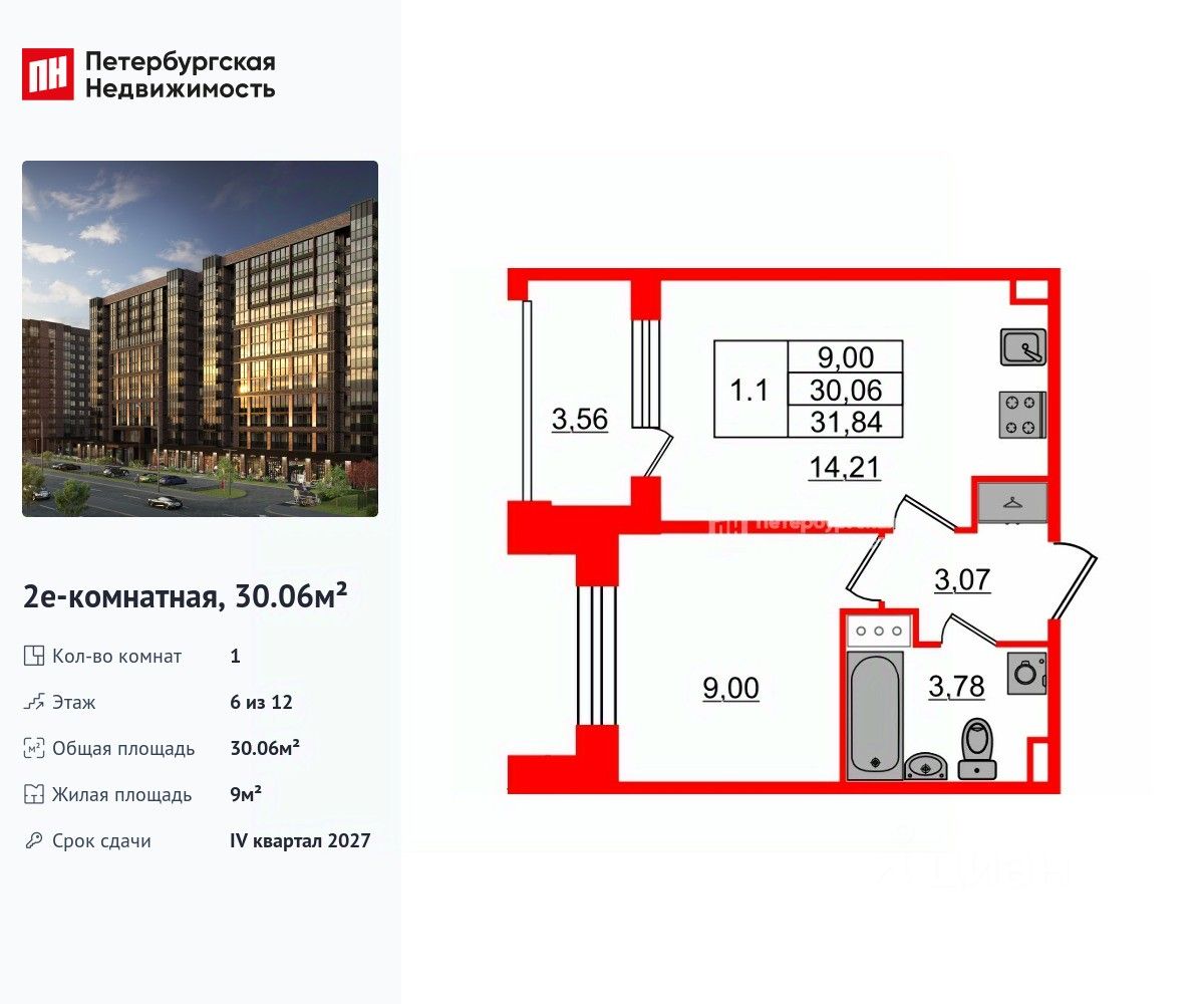 Удобная, классическая, функциональная европланировка, большая кухня-гостиная 14.21 м², вместительная прихожая 3.07 м². Общая площадь квартиры - 30.06 м², жилая 9 м², высота потолка 2.75 м.