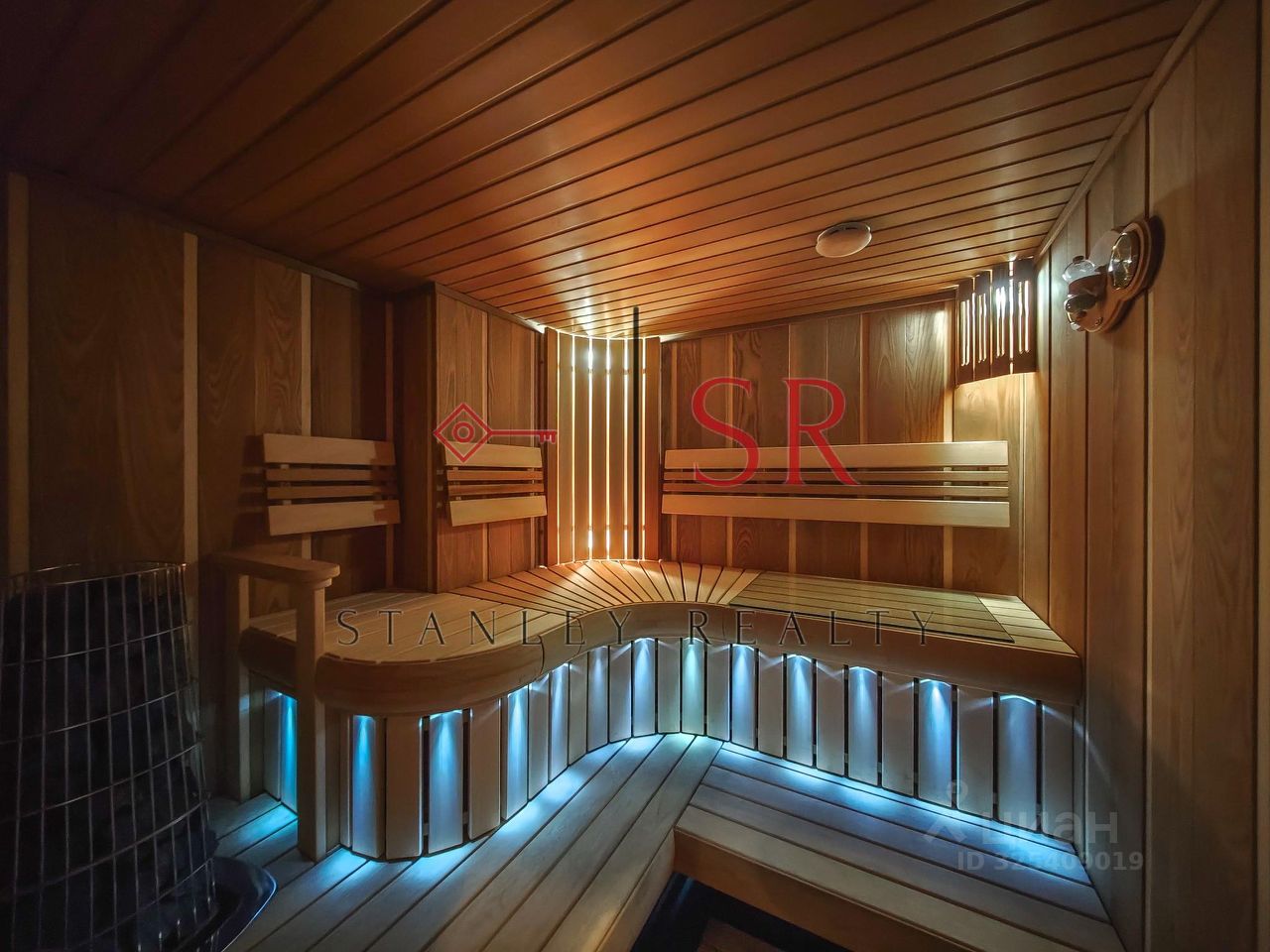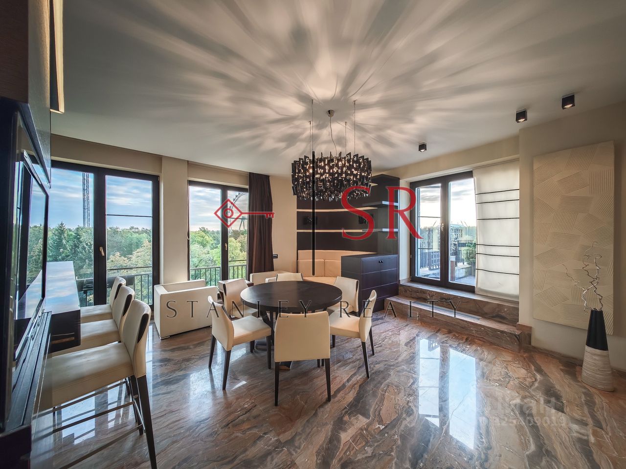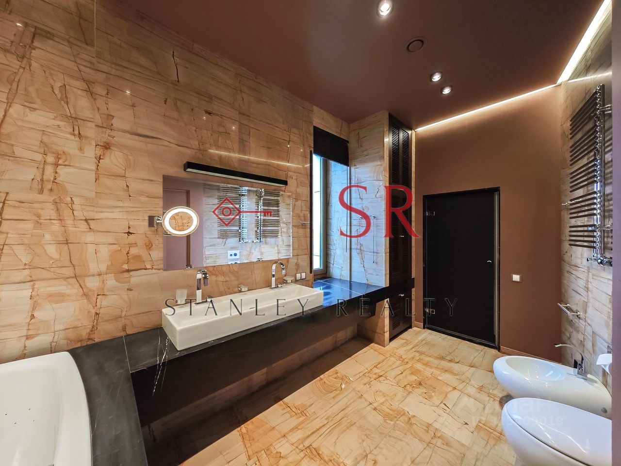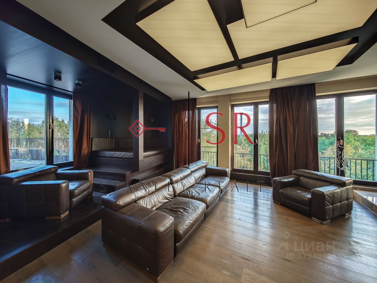 Особый акцент сделан на эстетике, продуманном комфорте и использовании премиальных строительных материалов. Полы выполнены из мрамора с системой подогрева. Гармоничное сочетание натурального дерева и кожи воссоздаёт атмосферу колониального стиля с его изысканной сдержанностью и классическими мотивами. Потолки высотой 3,3 метра и панорамное остекление придают интерьеру особую выразительность и большое количество естественного света. Отдельного внимания заслуживает профессионально спроектированная система освещения.