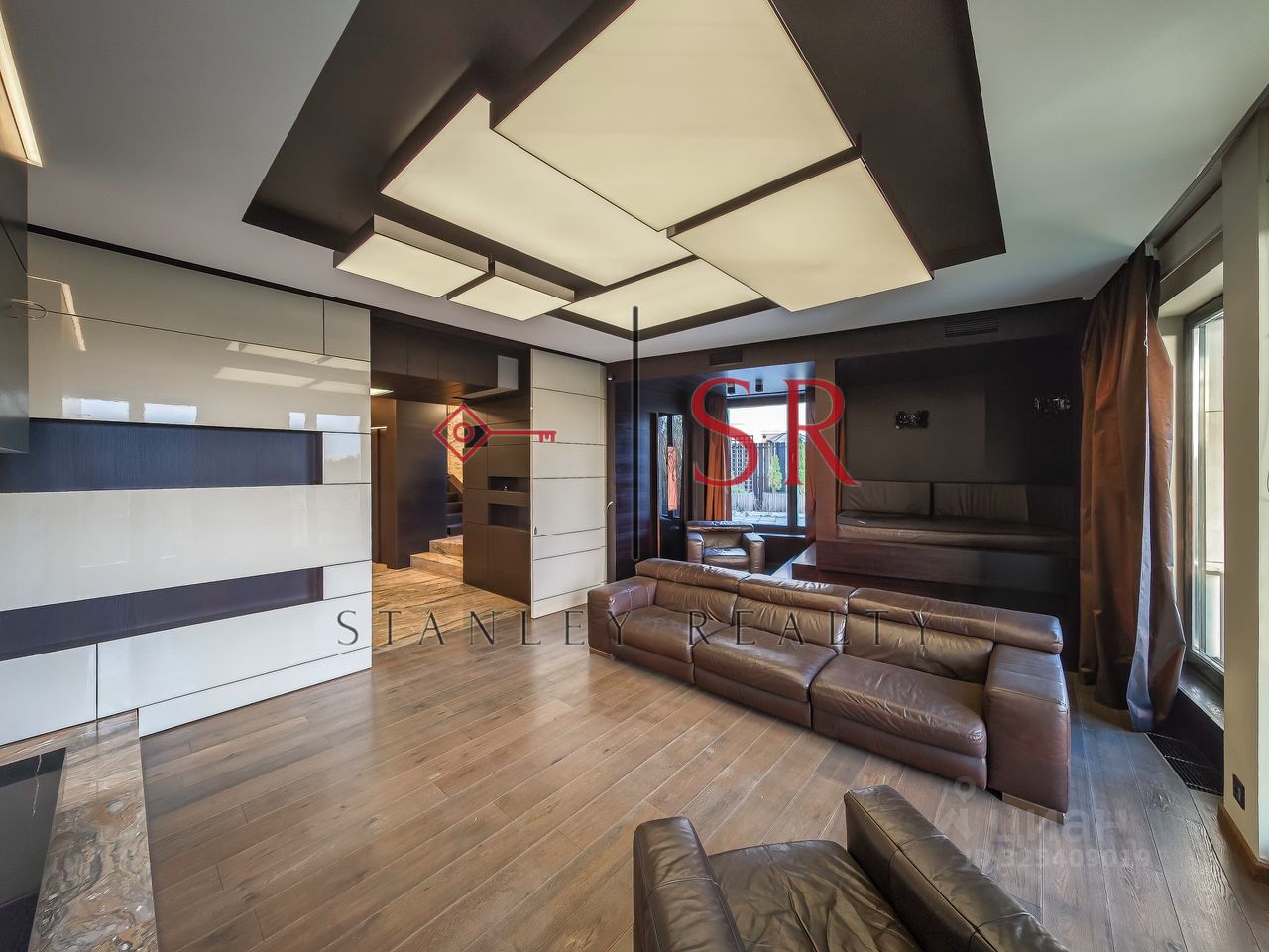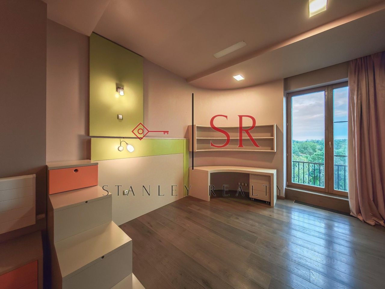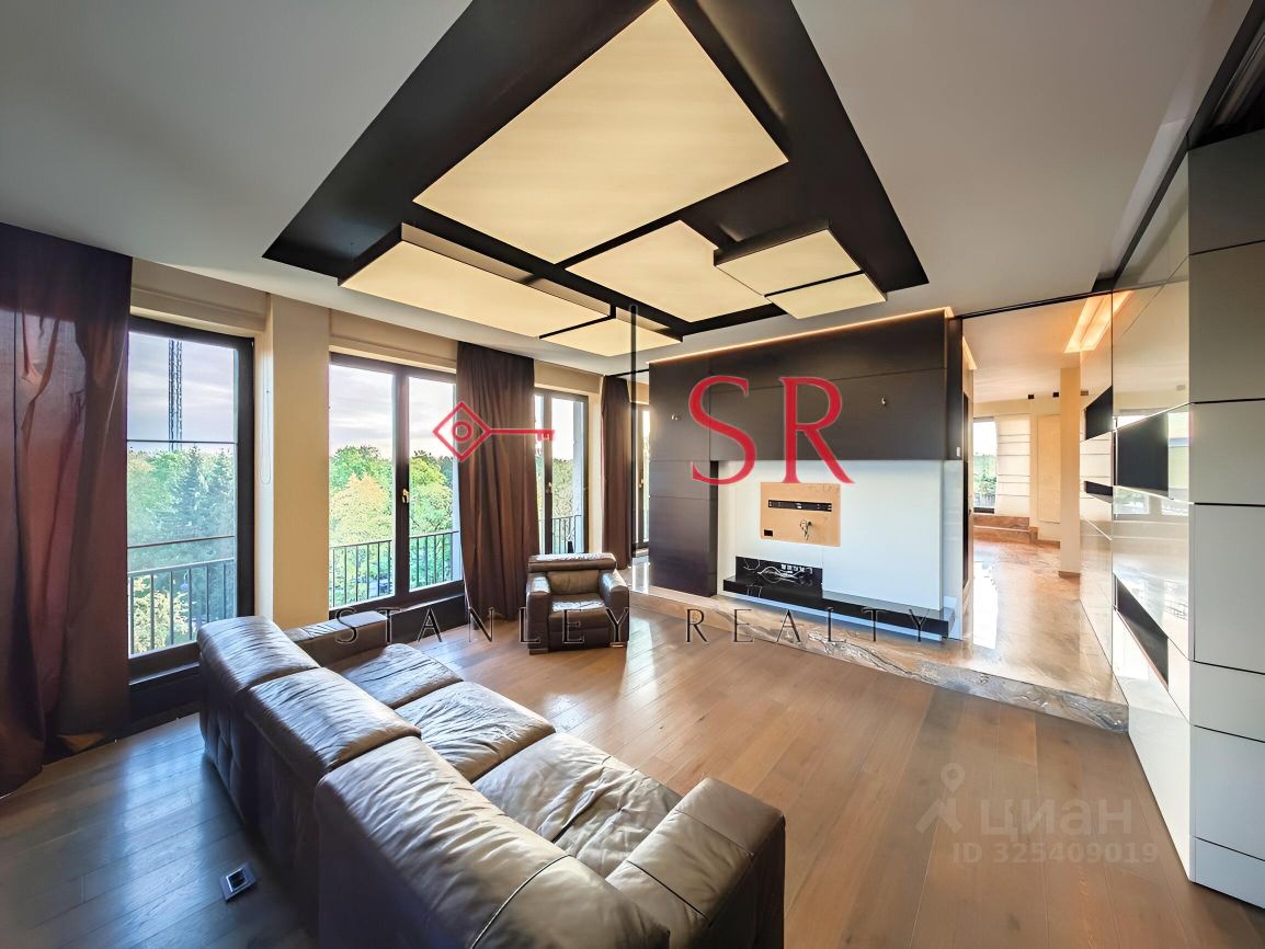 Ремонт выполнен в современном стиле с удобной планировкой : Первый уровень включает: - просторную гостиную, - кухню-столовую с выходом на террасу, - гардеробную, - прихожую с гостевым санузлом и выходом на вторую террасу, - кабинет, - ванная комната с сауной и душевой. Верхний уровень: - две спальни с выходом на открытый балкон - три детские комнаты, - гардеробная комната, - ванная комната, - постирочная.