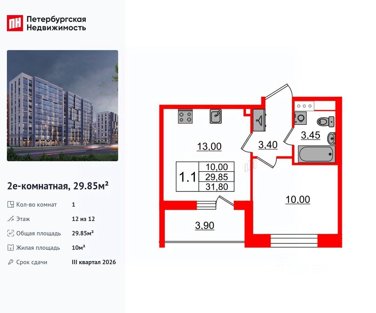 Удобная, классическая, функциональная европланировка, большая кухня-гостиная 13 м², вместительная прихожая 3.4 м². Общая площадь квартиры - 29.85 м², жилая 10 м², высота потолка 3 м.