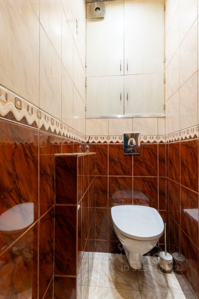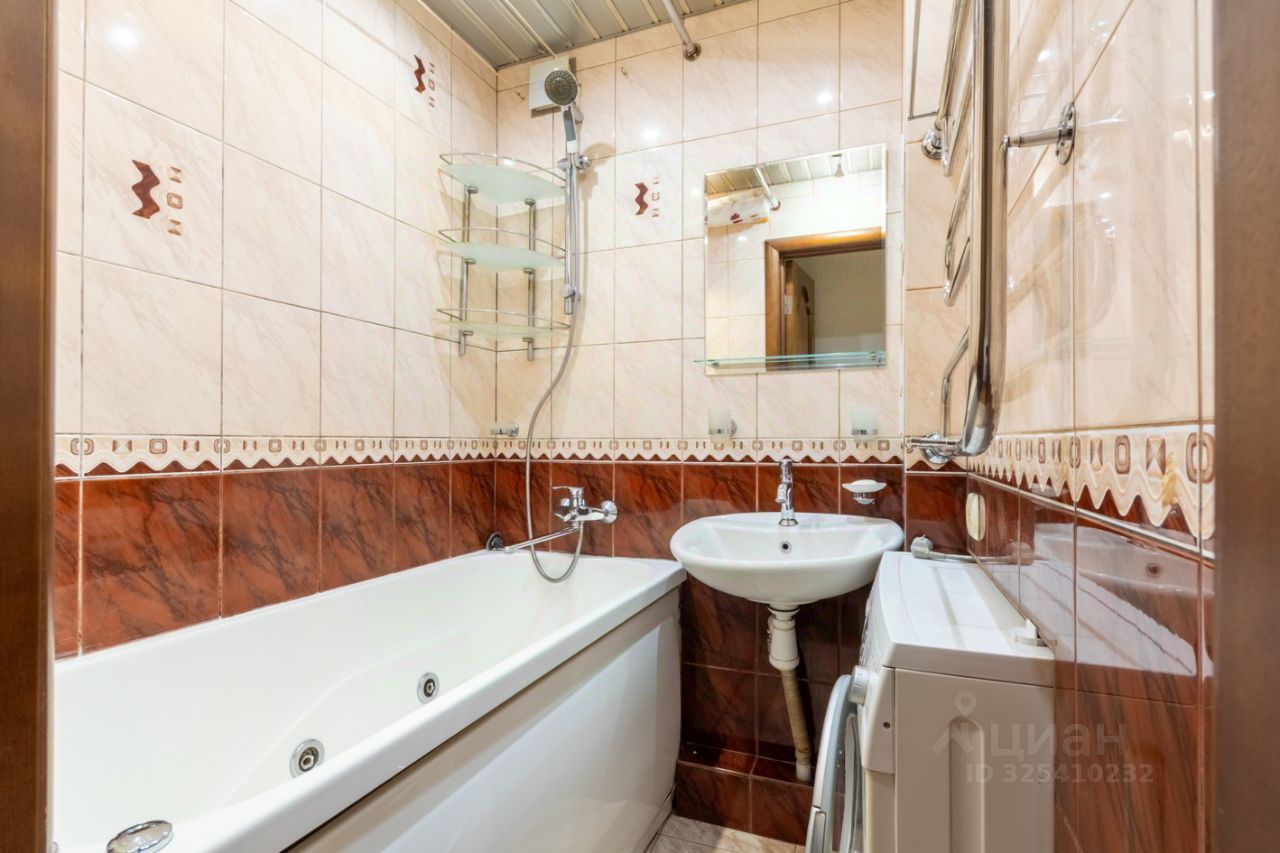 Санузел отделан кафелем. Оформлена ниша между туалетом и ванной для стиральной машины, что позволяет сэкономить пространство.