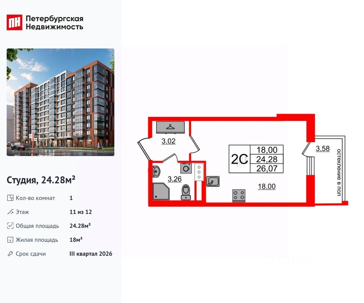 Удобная, классическая, функциональная европланировка, вместительная прихожая 3.02 м². Общая площадь студии - 24.28 м², жилая 18 м², высота потолка 2.77 м.