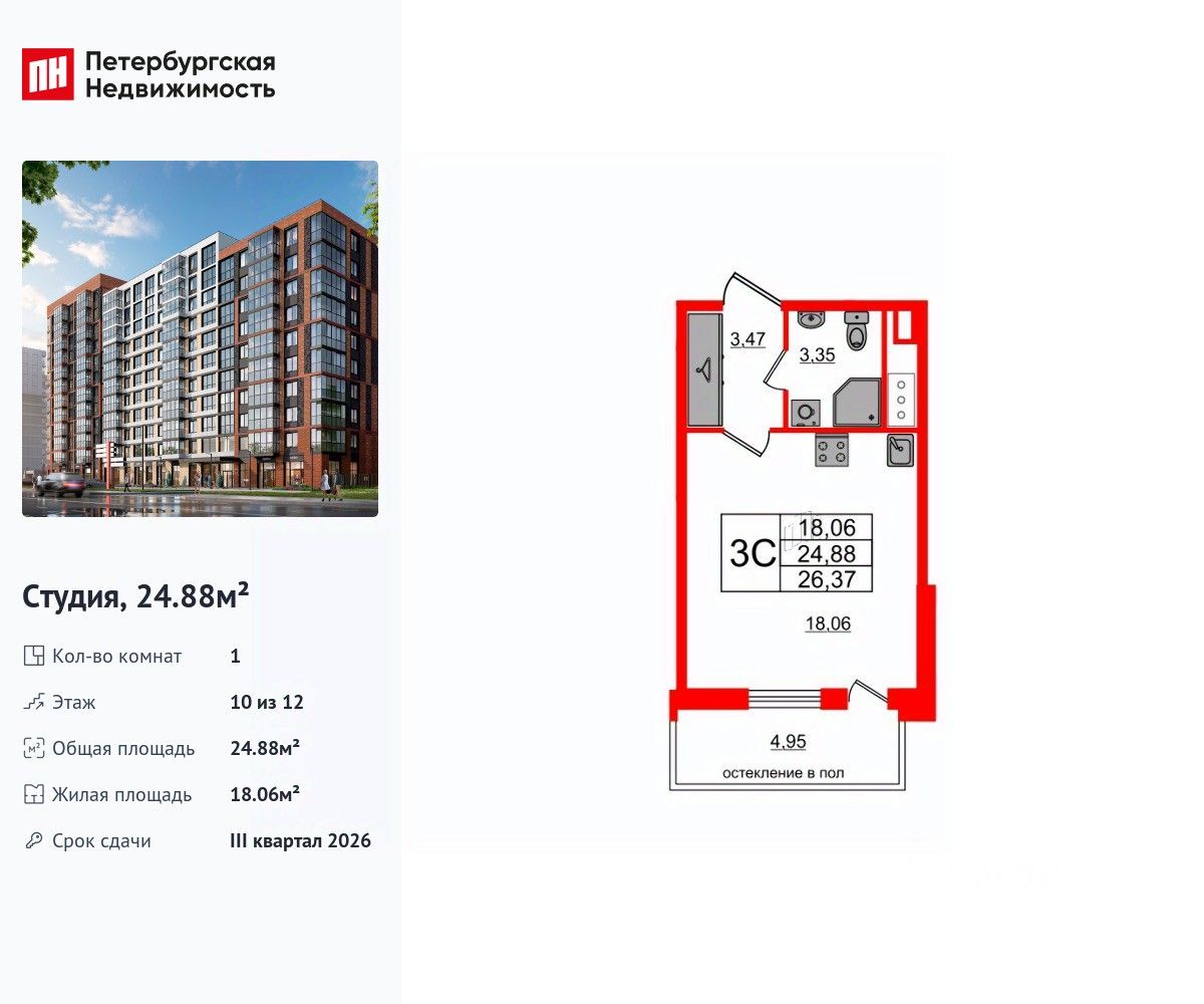 Удобная, классическая, функциональная европланировка, просторная прихожая 3.47 м². Общая площадь студии - 24.88 м², жилая 18.06 м², высота потолка 2.77 м.