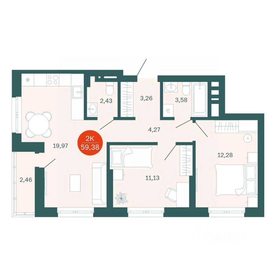 Общая площадь59,38 м2