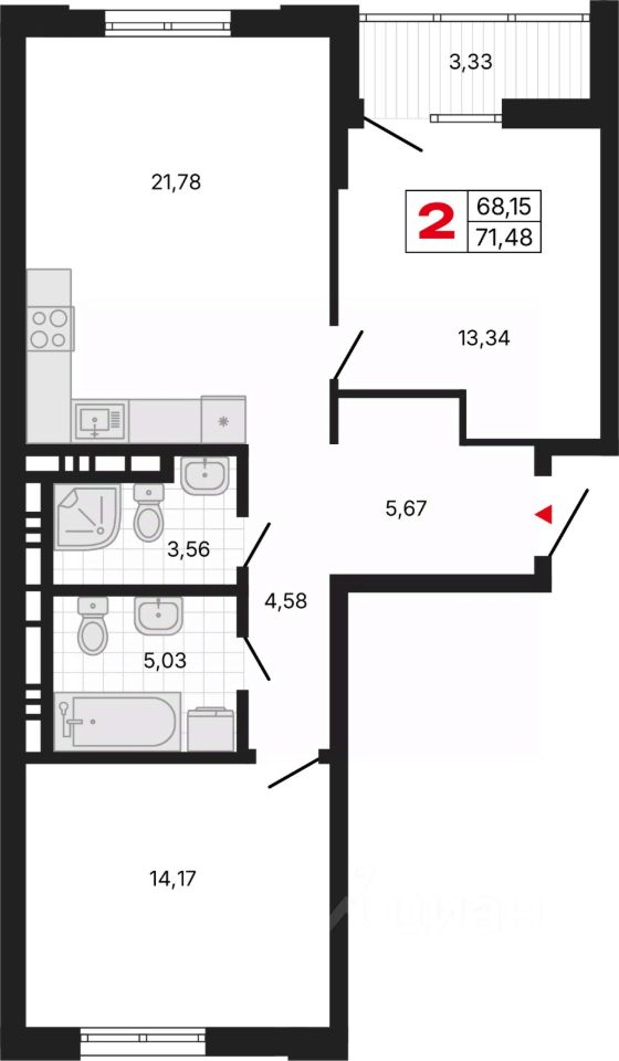 Продается 2-комн. квартира от застройщика с предчистовой отделкой в ЖК ''Милый дом'' на 4 этаже. Общая площадь: 71.46 кв.м., жилая: 27.51 кв.м., площадь просторной кухни-столовой: 21.78 кв.м. Квартира - распашонка, без проходных комнат, окна выходят на paзные стороны дома. В квартире одна лоджия, два совмещенных санузла. Высота потолков 2.7 м.