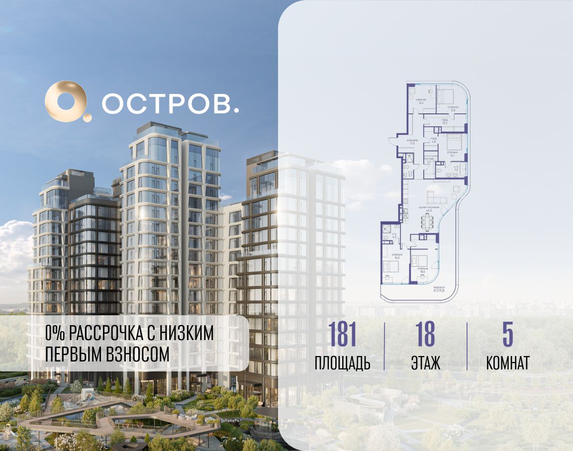 ОСТРОВ от Донстрой - жилой комплекс на западе Москвы, в Мневниковской пойме. Уникальное преимущество комплекса - в том, что он обособлен от города рекой и природным парком (650 га). Благодаря природному окружению эта территория имеет лучший экологический рейтинг в столице. Кварталы ОСТРОВА объединены ландшафтным дизайном в единое пространство - с набережными и Центральным бульваром. На ОСТРОВЕ любые объекты, необходимые для полноценной жизни и отдыха, находятся на расстоянии 15-минутной прогулки. Торговый центр и супермаркеты, кафе и рестораны, фитнес, салоны красоты, школы и детские сады. А также крупнейший в Москве спортивный кластер.