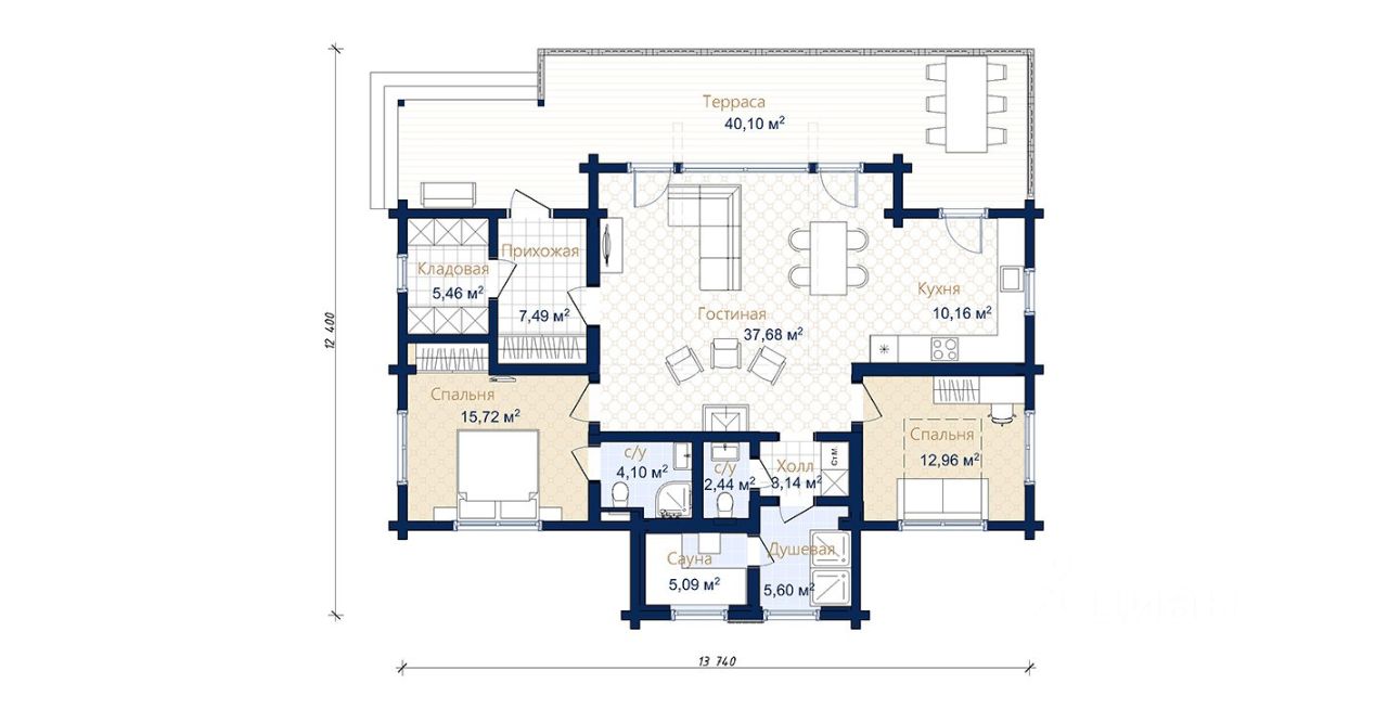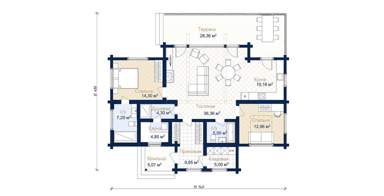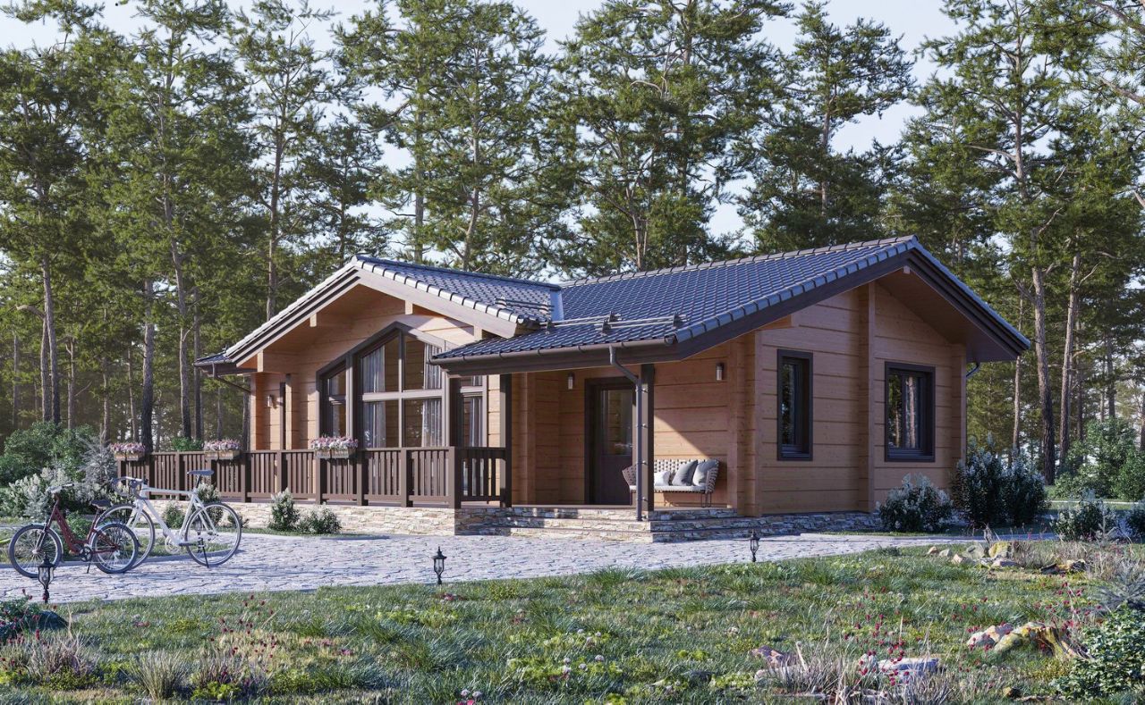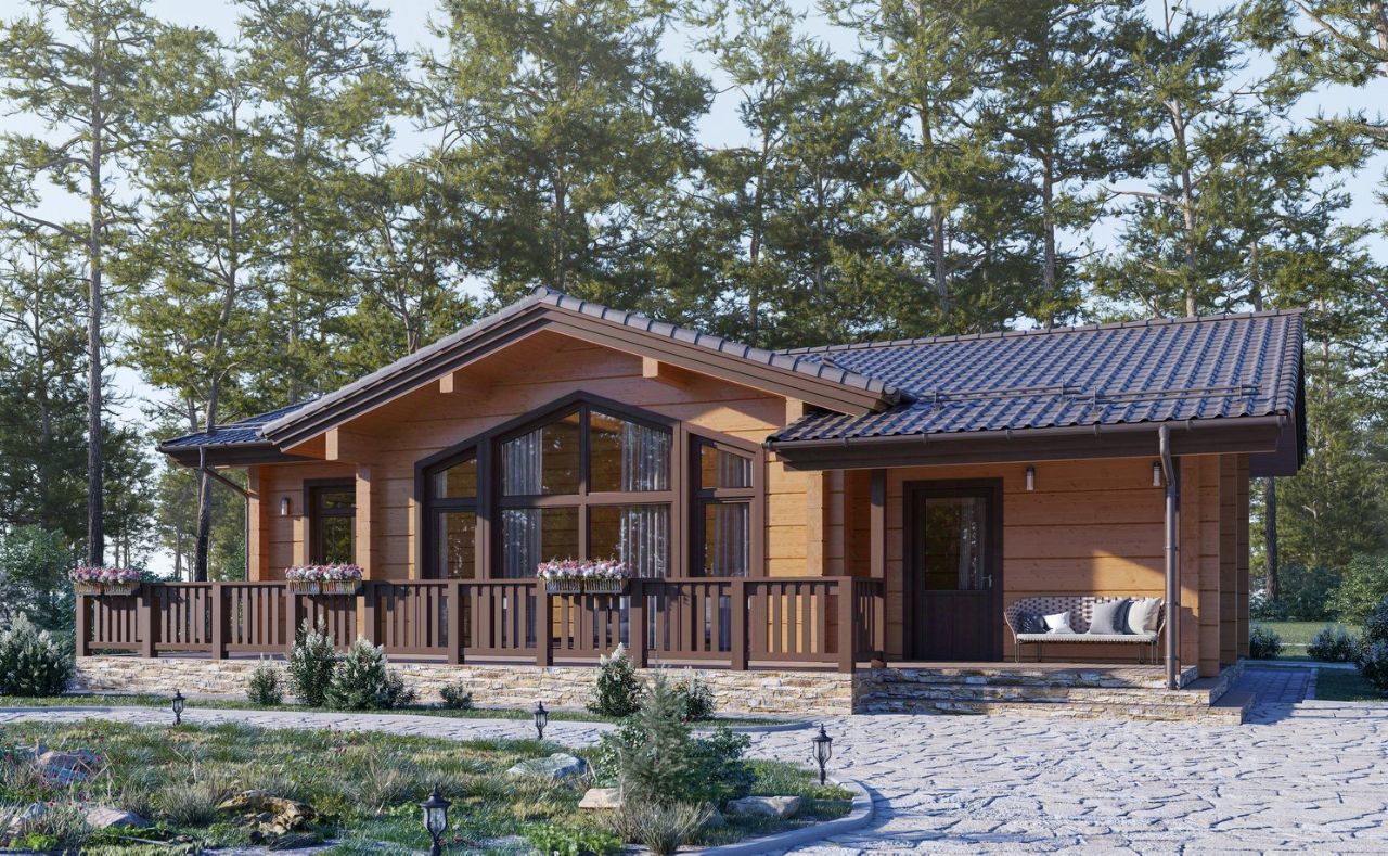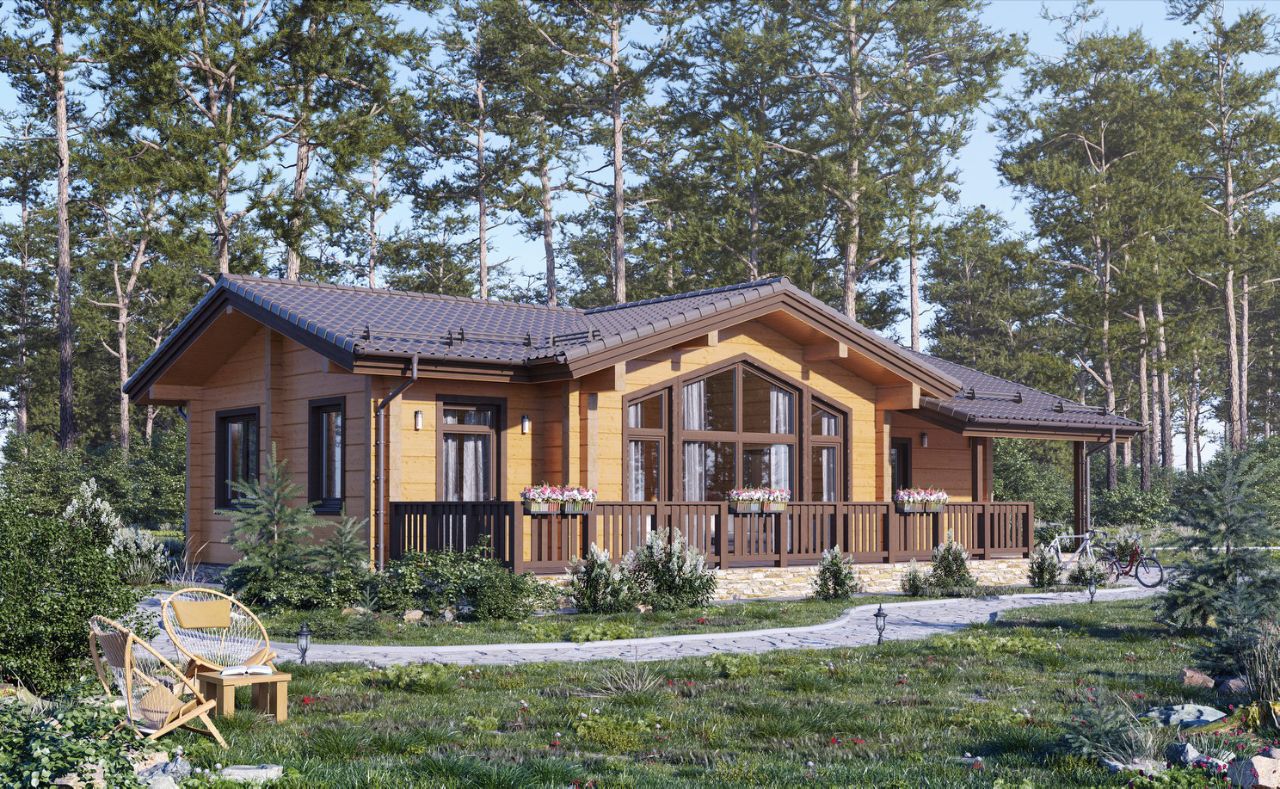 Особенности дома ''Ильма 150'' — Площадь дома: 150 м² идеально для семьи и приема гостей. — Материал: экологичный клееный брус тепло, долговечность и стиль. — Дизайн: изысканная архитектура с большими окнами и террасой с выходом из гостинной. — Планировка: 2 спальни, 2 санузла, сауна, терраса.
