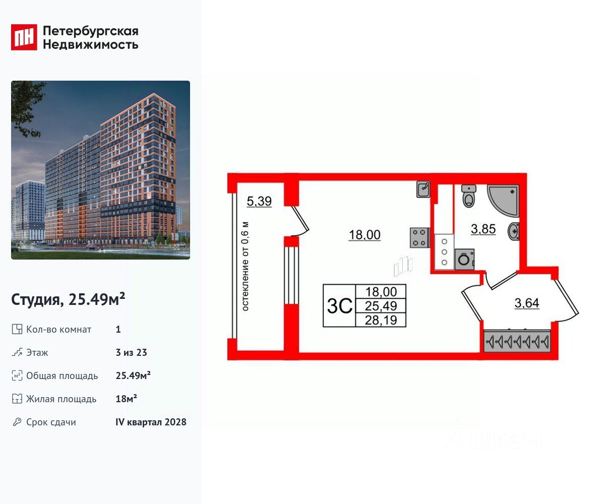 Общая площадь25,49 м2