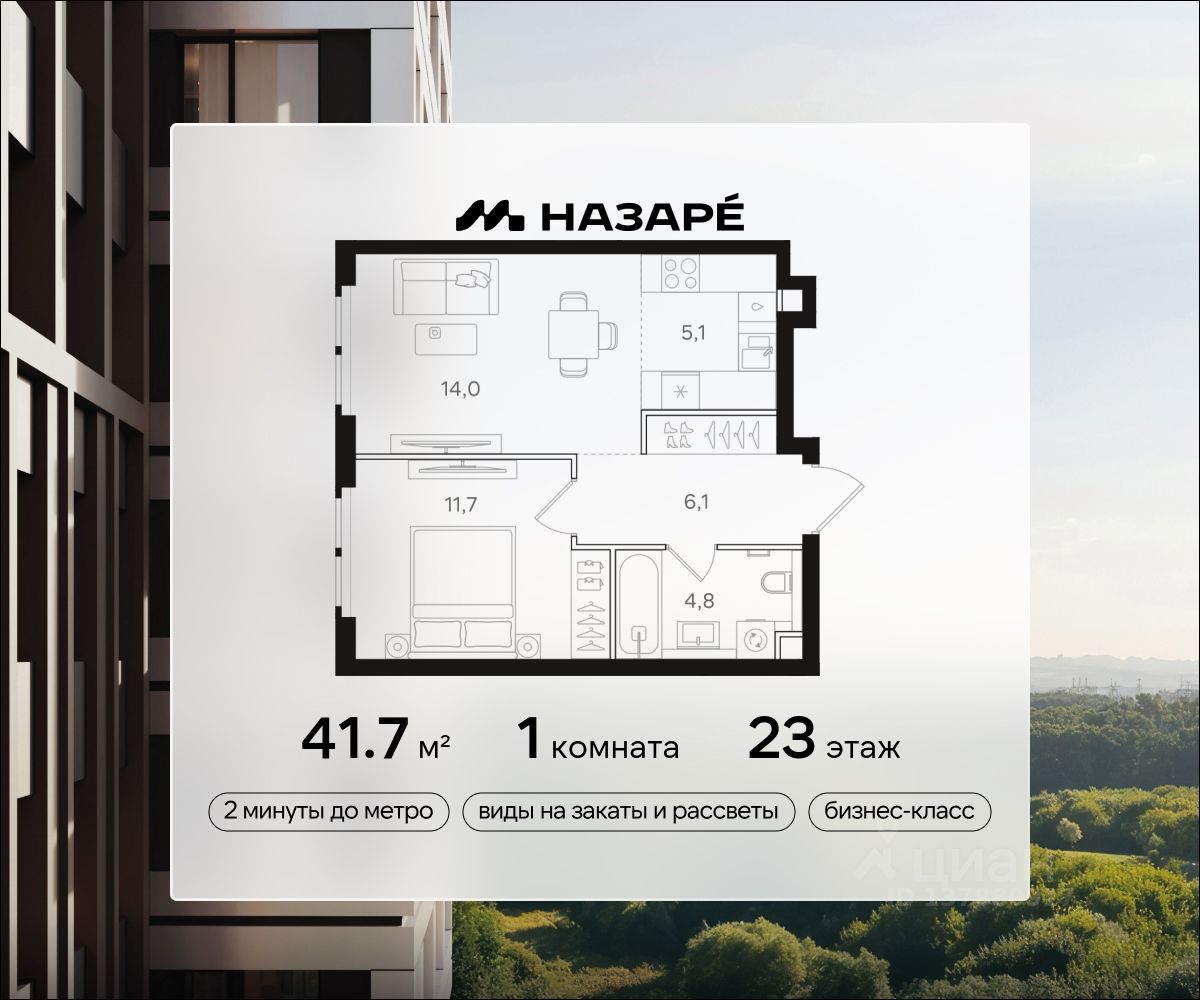 Продается 1-комнатная квартира в ЖК ''НАЗАРЕ''' Общая площадь - 41.70 Тип дома - монолитный Этаж - 23 Год сдачи - 2028 Предлагается квартира площадью 41.70 кв. м в новом современном квартале на востоке Москвы, прямо у станций метро и МЦК ''Бульвар Рокоссовского''. Квартира располагается в корпусе 3 на 23 этаже комплекса бизнес-класса ''НАЗАРЕ'''.