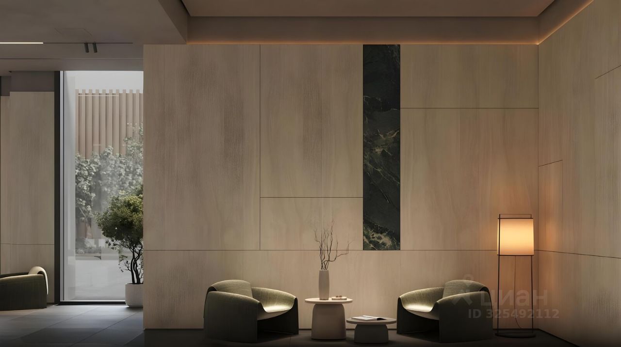 • дизайнерские лобби от бюро ABOVE ARCHITECTURE с панорамными окнами, интерьерами в теплой цветовой гамме и мягкой зоной ожидания располагаются в каждой башне,
