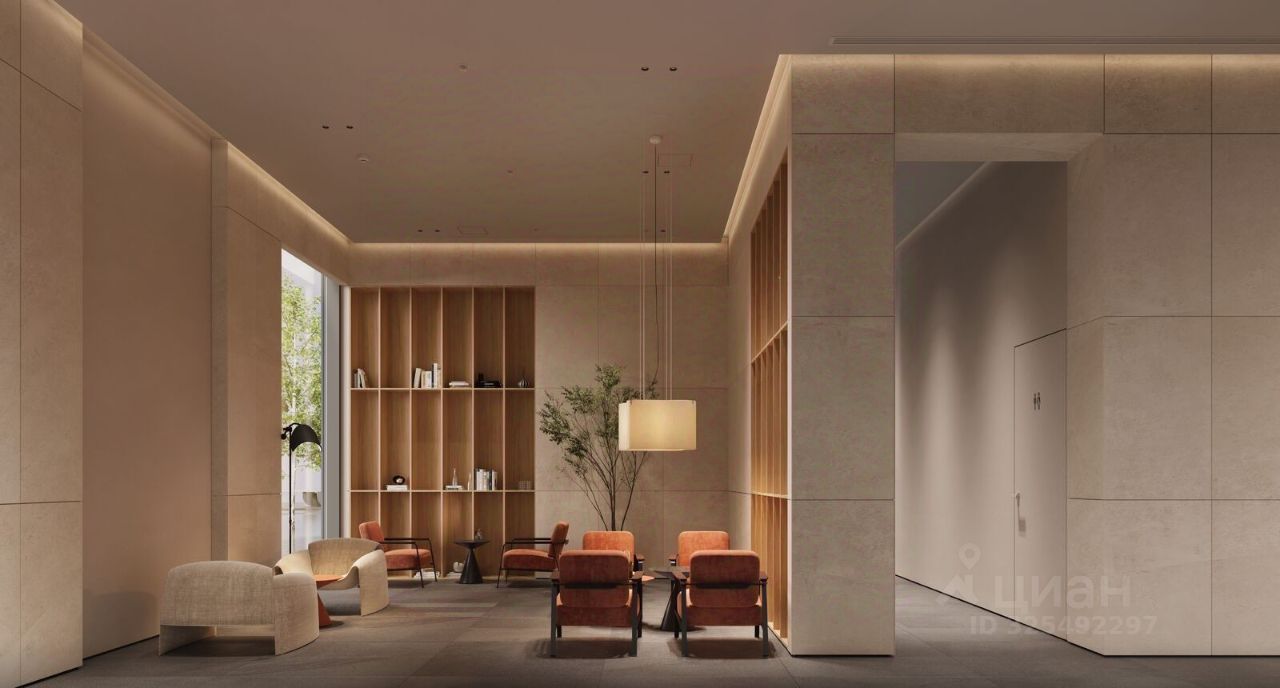• дизайнерские лобби от бюро ABOVE ARCHITECTURE с панорамными окнами, интерьерами в теплой цветовой гамме и мягкой зоной ожидания располагаются в каждой башне,