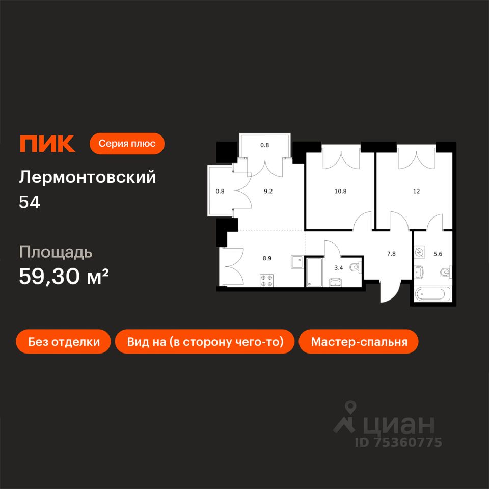 Продаётся 2-комн. квартира площадью 59,3 кв.м на 2 этаже 7 этажного дома (Корпус 2.1, Секция 7) проекта ПИК Лермонтовский 54. Светлый просторный подъезд на уровне земли, функциональная планировка, большие окна, без отделки.