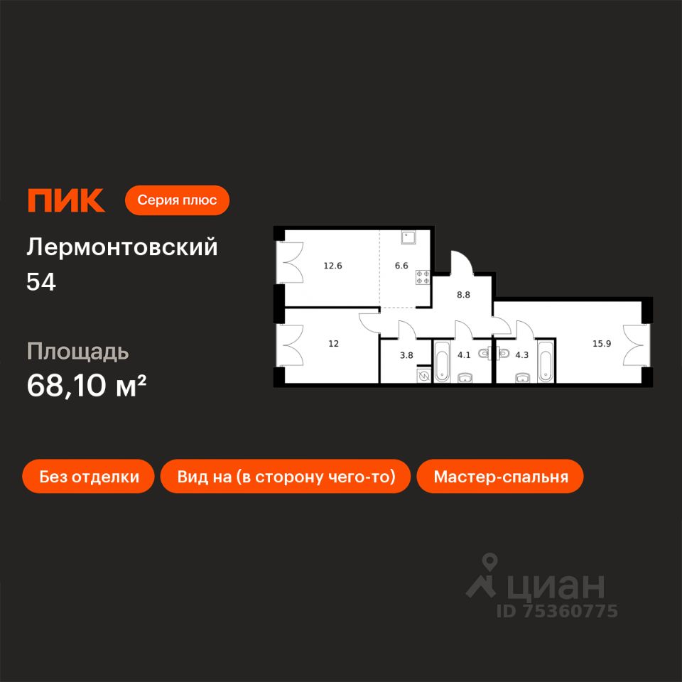 Продаётся 2-комн. квартира площадью 68,1 кв.м на 7 этаже 9 этажного дома (Корпус 2.2, Секция 12) проекта ПИК Лермонтовский 54. Светлый просторный подъезд на уровне земли, функциональная планировка, большие окна, без отделки.