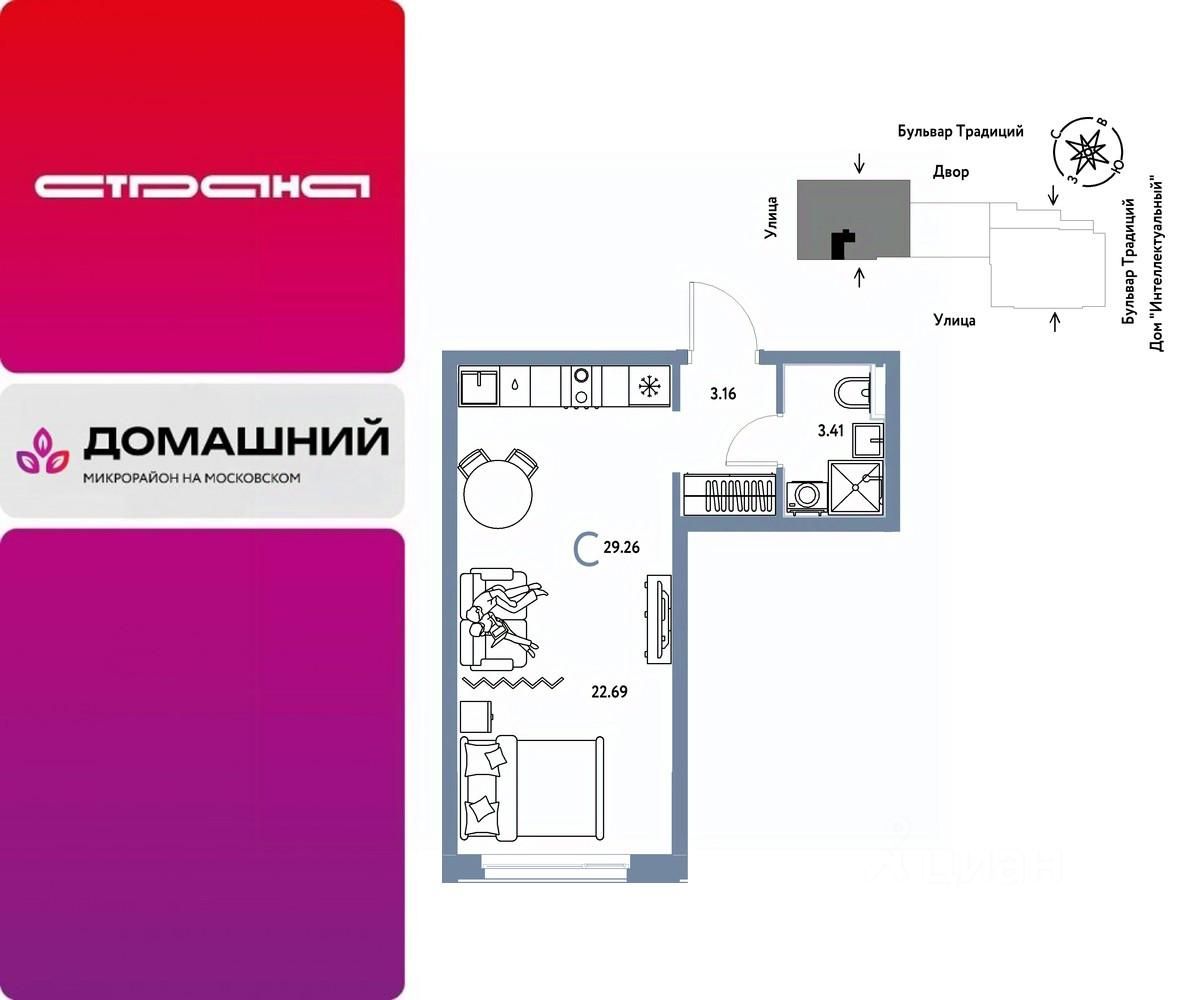 Продается 1комнатная квартира на 9 этаже от застройщика Страна Девелопмент. Площадь квартиры 29,26 кв. м. Стоимость указана без учета акций.