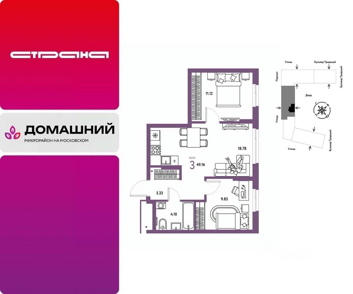 Продается 3комнатная квартира на 8 этаже от застройщика Страна Девелопмент. Площадь квартиры 49,16 кв. м.