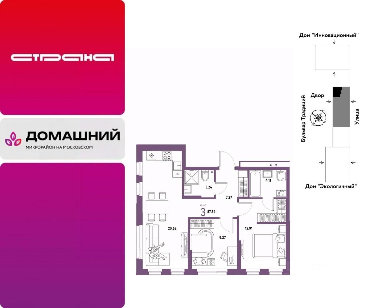 Продается 3комнатная квартира на 13 этаже от застройщика Страна Девелопмент. Площадь квартиры 57,52 кв. м.