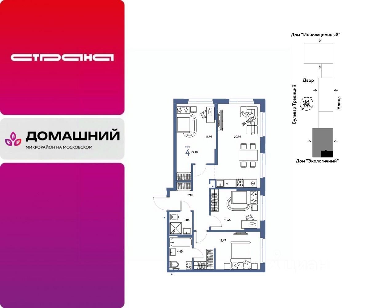 Продается 4комнатная квартира на 11 этаже от застройщика Страна Девелопмент. Площадь квартиры 79,18 кв. м.
