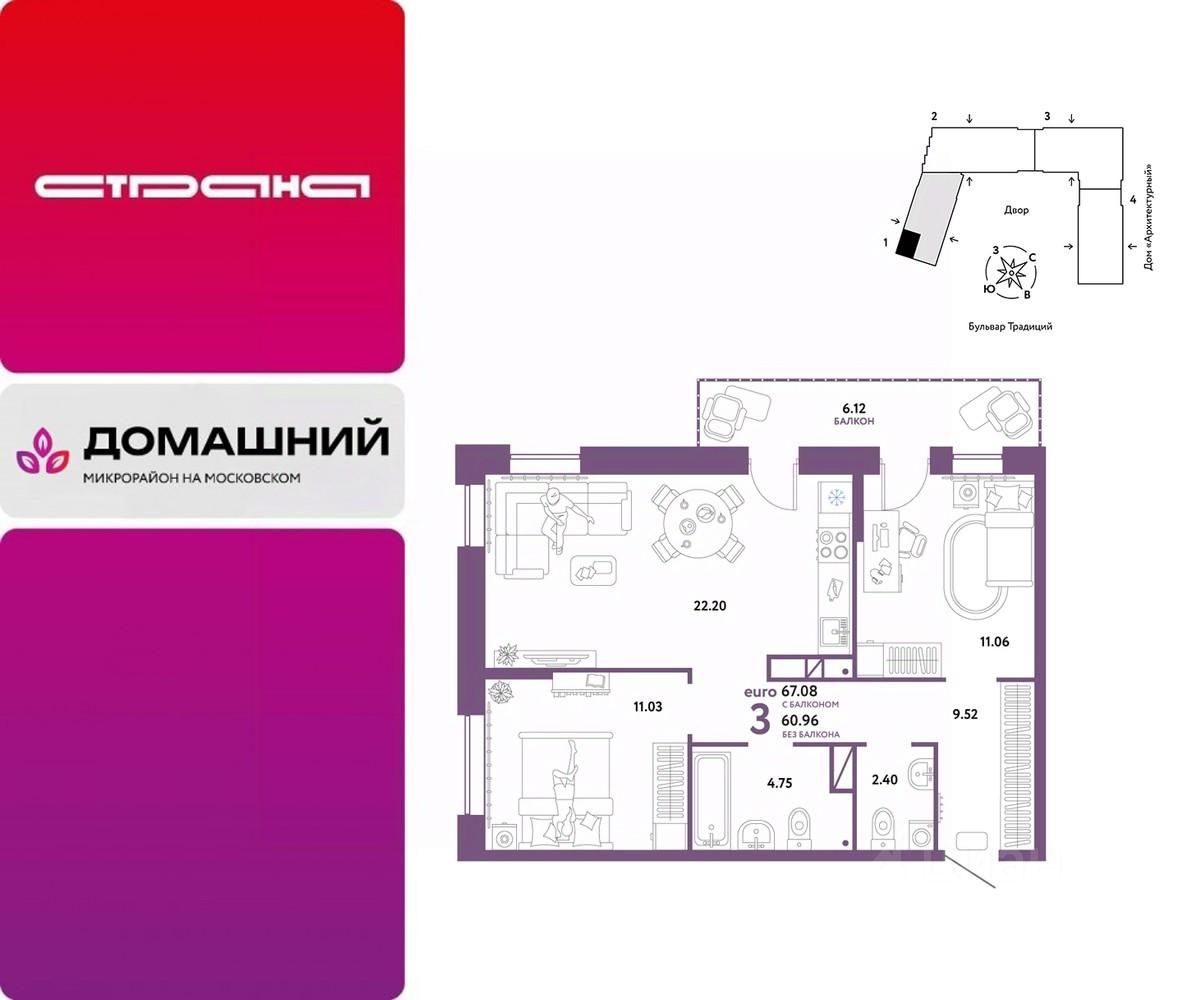 Продается 3комнатная квартира на 3 этаже от застройщика Страна Девелопмент. Площадь квартиры 67,08 кв. м. Стоимость указана без учета акций.