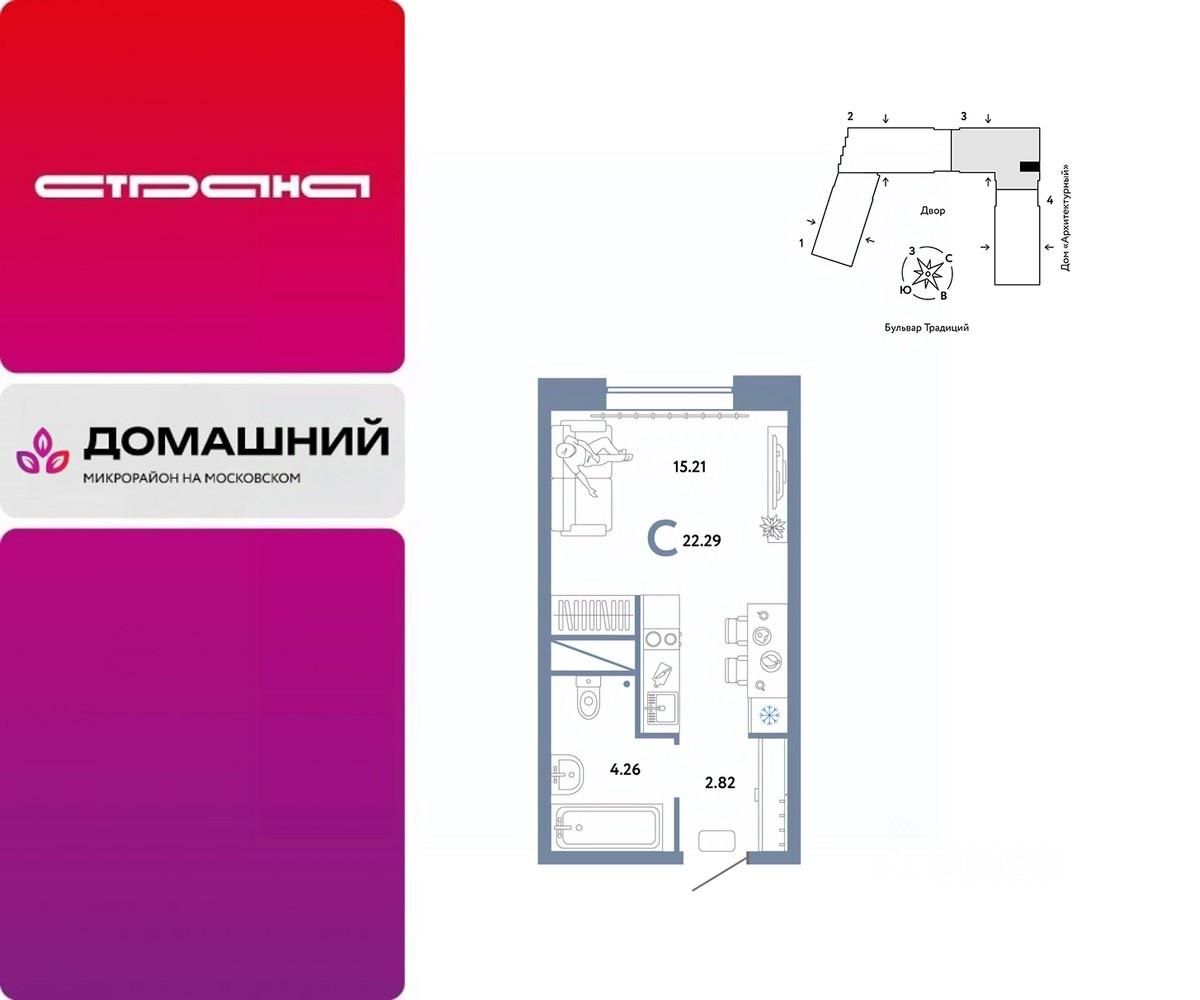Продается 1комнатная квартира на 8 этаже от застройщика Страна Девелопмент. Площадь квартиры 22,29 кв. м. Стоимость указана без учета акций.