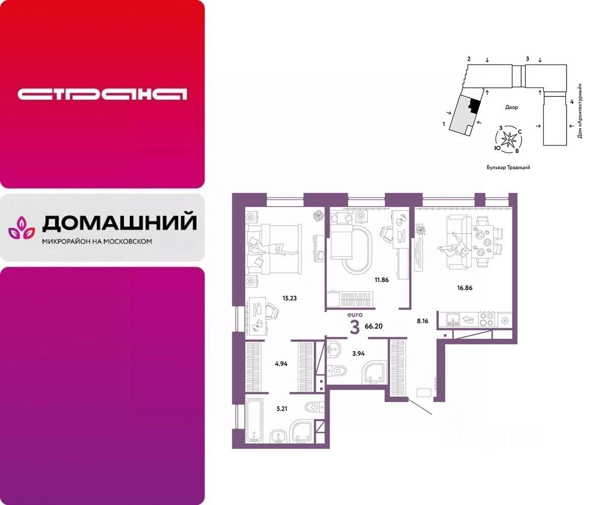 Продается 3комнатная квартира на 13 этаже от застройщика Страна Девелопмент. Площадь квартиры 66,2 кв. м. Стоимость указана без учета акций.
