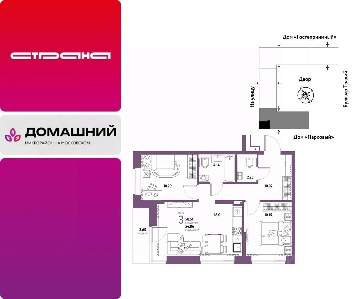 Продается 3комнатная квартира на 13 этаже от застройщика Страна Девелопмент. Площадь квартиры 58,51 кв. м.