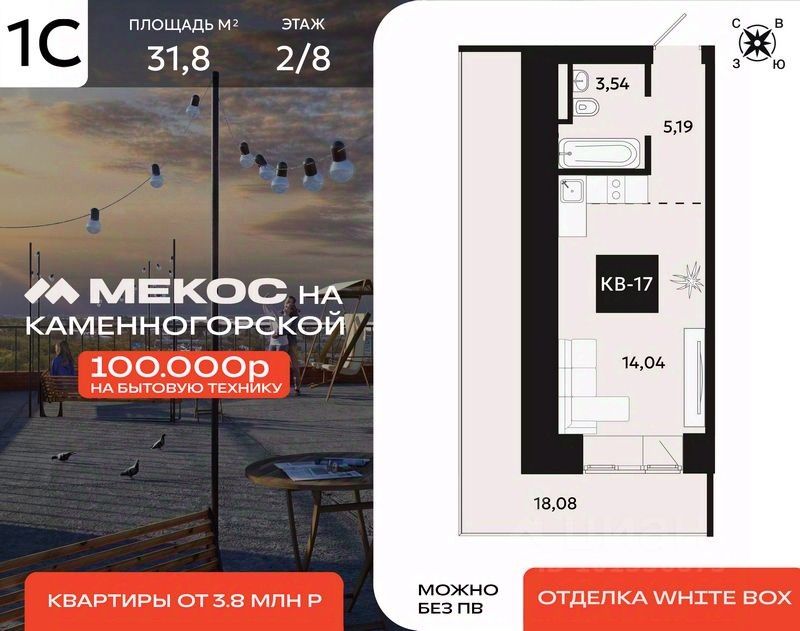 Квартира в отделке WhiteBox. Действует акция - квартира в ипотеку без первоначального взноса. В наших ЖК можно купить квартиру от 3.6 млн.р, а на студии сейчас подарок - 100 тыс. руб на покупку бытовой техники.