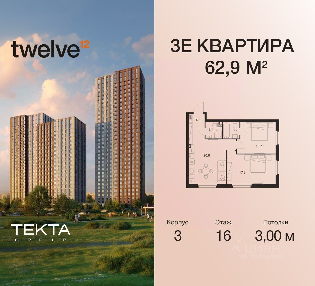 3-комн. квартира в ЖК ''Twelve'' на 16 этаже в 28 этажном здании Корпус 3. Общая площадь: 62.9 кв.м., жилая: 44.40 кв.м. Высота потолков 3.00 м.