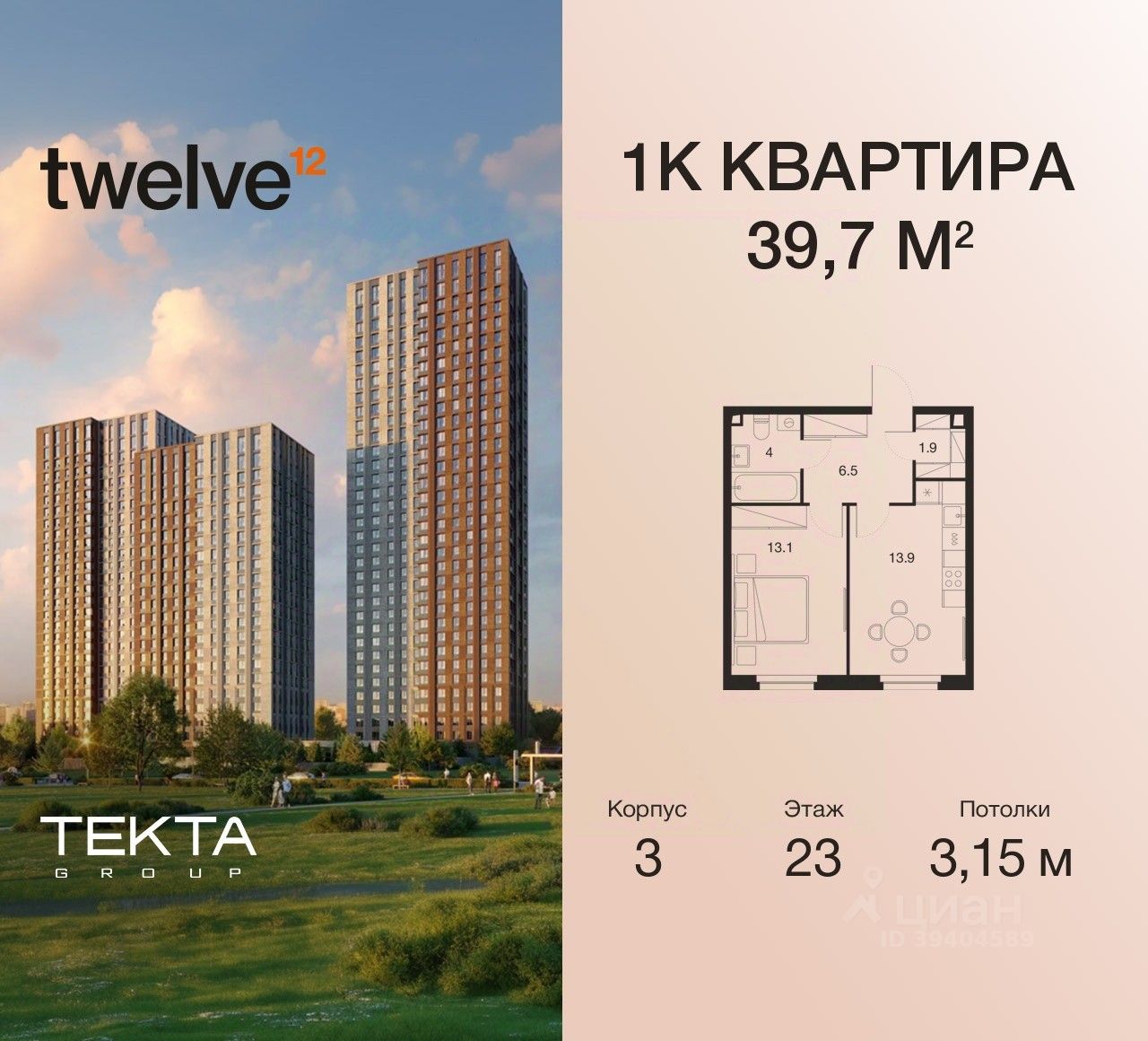 1-комн. квартира в ЖК ''Twelve'' на 23 этаже в 28 этажном здании Корпус 3. Общая площадь: 39.7 кв.м., жилая: 13.20 кв.м. Высота потолков 3.15 м.