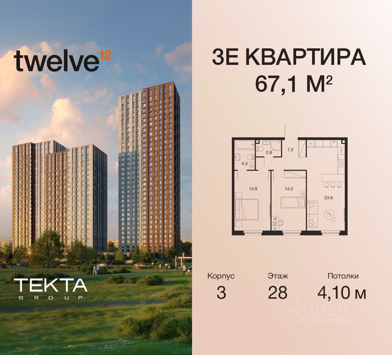 3-комн. квартира в ЖК ''Twelve'' на 28 этаже в 28 этажном здании Корпус 3. Общая площадь: 67.1 кв.м., жилая: 42.60 кв.м. Высота потолков 4.10 м.