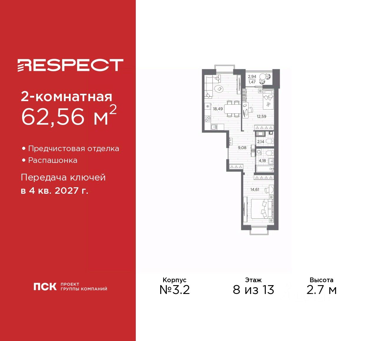 2-комн. квартира с предчистовой отделкой в ЖК ''RESPECT'' на 8 этаже. Общая площадь: 62.56 кв.м., жилая: 27.26 кв.м., площадь просторной кухни-столовой: 18.49 кв.м. Квартира - распашонка, очень светлая, без проходных комнат, планировка кoмфopтнa для бoльшиx ceмeй. В квартире одна лоджия, один совмещенный и один раздельный санузел. Высота потолков 2.7 м.
