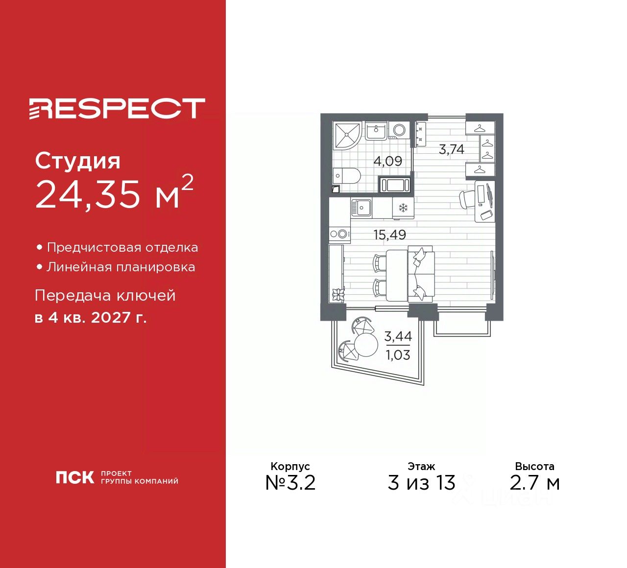 1-комн. квартира-студия с предчистовой отделкой в ЖК ''RESPECT'' на 3 этаже. Общая площадь: 24.35 кв.м., площадь гостиной 15.49 кв.м., из которых 5 кв.м. выделено под кухонную зону. Все окна выходят на одну сторону. В квартире один балкон, один совмещенный санузел. Высота потолков 2.7 м.