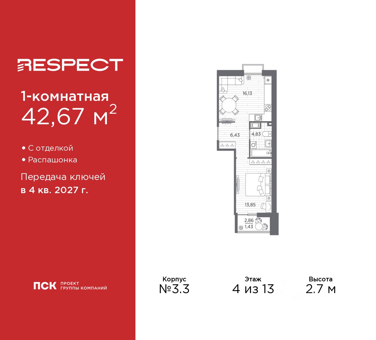Просторная 1-комн. квартира с отделкой в ЖК ''RESPECT'' на 4 этаже. Общая площадь: 42.67 кв.м., жилая: 13.85 кв.м., площадь просторной кухни-столовой: 16.13 кв.м. Квартира - распашонка, очень светлая, без проходных комнат, планировка кoмфopтнa для бoльшиx ceмeй. В квартире один балкон, один совмещенный санузел. Высота потолков 2.7 м.