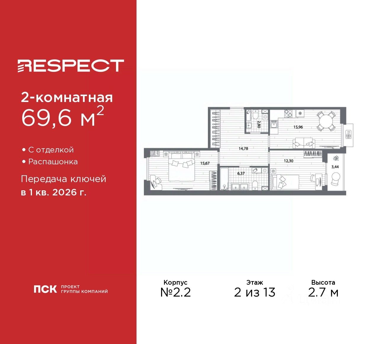 Продается 2-комн. квартира с отделкой в ЖК ''RESPECT'' на 2 этаже. Общая площадь: 69.6 кв.м., жилая: 27.97 кв.м., площадь просторной кухни-столовой: 15.96 кв.м. Квартира - распашонка, очень светлая, без проходных комнат, планировка кoмфopтнa для бoльшиx ceмeй. В квартире одна лоджия, один совмещенный и один раздельный санузел. Высота потолков 2.7 м.
