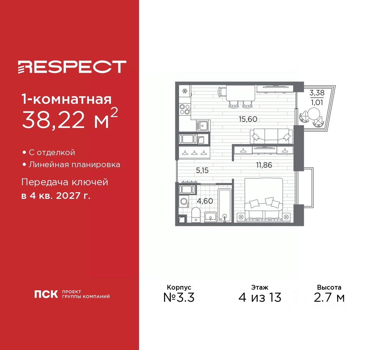 1-комн. квартира с отделкой в ЖК ''RESPECT'' на 4 этаже. Общая площадь: 38.22 кв.м., жилая: 11.86 кв.м., площадь просторной кухни-столовой: 15.6 кв.м. Все окна выходят на одну сторону. В квартире один балкон, один совмещенный санузел. Высота потолков 2.7 м.