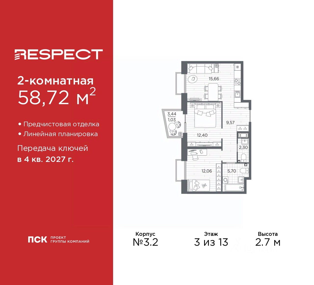 Просторная 2-комн. квартира с предчистовой отделкой в ЖК ''RESPECT'' на 3 этаже. Общая площадь: 58.72 кв.м., жилая: 24.46 кв.м., площадь просторной кухни-столовой: 15.66 кв.м. Комнаты изолированные, все окна выходят на одну сторону. В квартире один балкон, один совмещенный и один раздельный санузел. Высота потолков 2.7 м.
