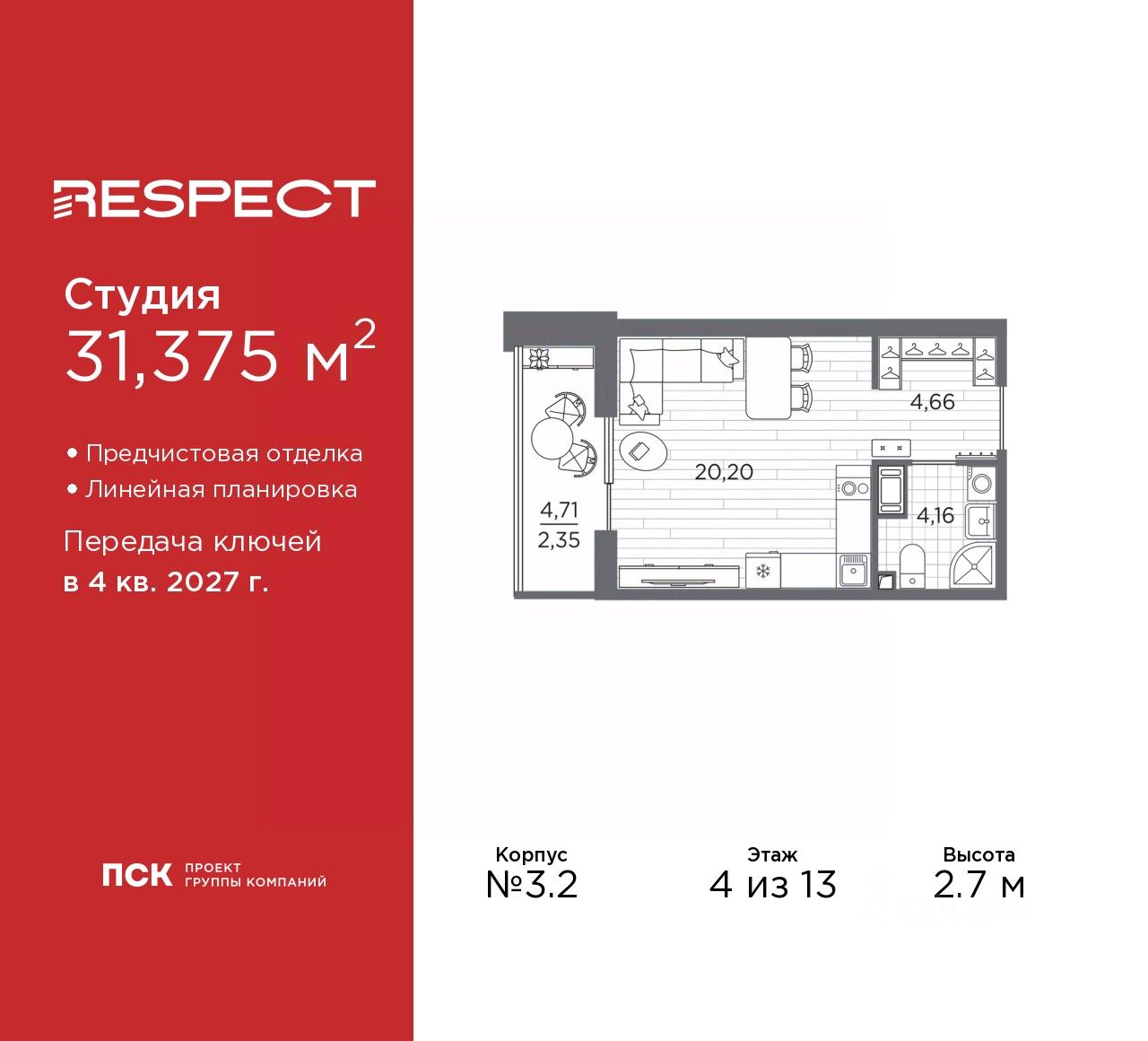 Продается 1-комн. квартира-студия с предчистовой отделкой в ЖК ''RESPECT'' на 4 этаже. Общая площадь: 31.375 кв.м., площадь гостиной 20.2 кв.м., из которых 5 кв.м. выделено под кухонную зону. Все окна выходят на одну сторону. В квартире один балкон, один совмещенный санузел. Высота потолков 2.7 м.